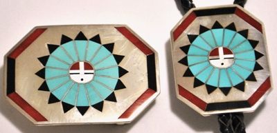 Zuni Multi-Stone Inlay Sunface Sterling Silver Bolo Tie & Buckle Set - Fred & Lolita Natachu
