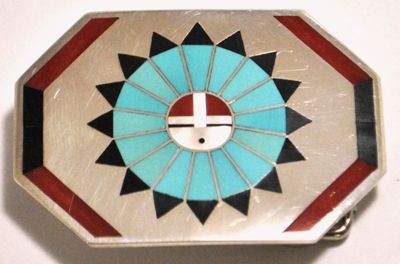 Zuni Multi-Stone Inlay Sunface Sterling Silver Buckle - Fred & Lolita Natachu
