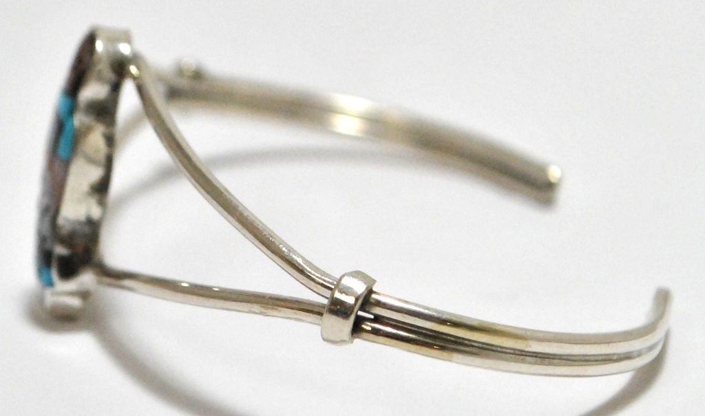 Measures 5-1/4" around with a 1" gap, 7/8" wide. Stones present: Turquoise, Mother of Pearl, Coral, Black Jet.