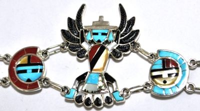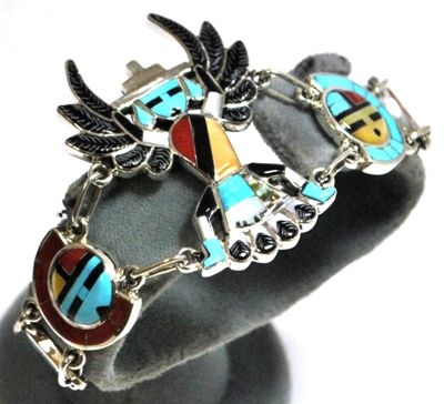 Zuni Multi-Stone Knifewing Kachina Sterling Silver Link Bracelet - Don Dewa