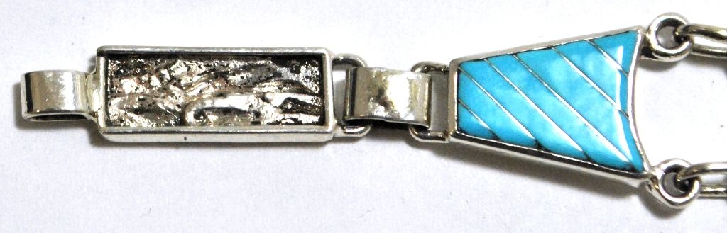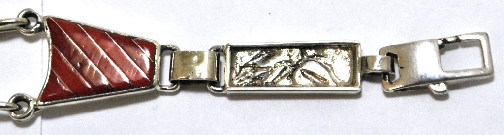 Measures 7-3/4" long by 1-3/4" wide. Stones present: Coral, Turquoise, Black Jet, Abalone, Golden-Lipped & White Mother of Pearl.