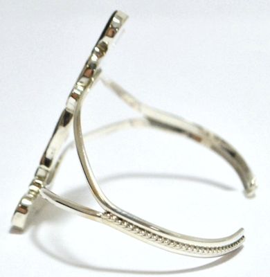 Measures 5-5/8" around with a 1" gap, 2" wide. Bracelet is malleable and easily bends to adjust to your wrist.