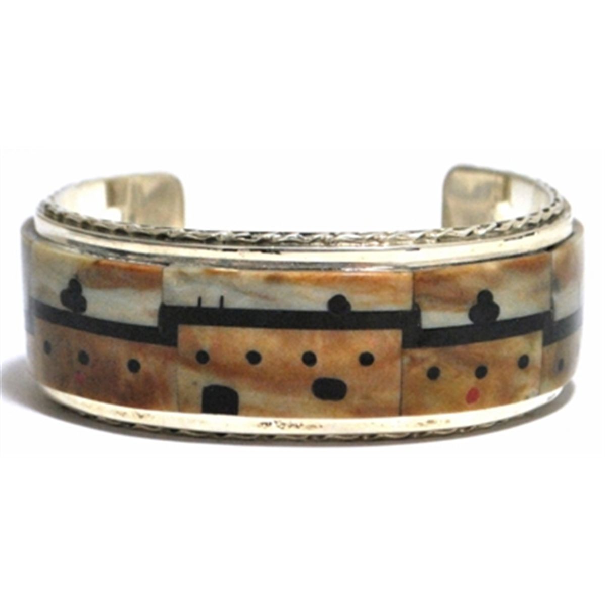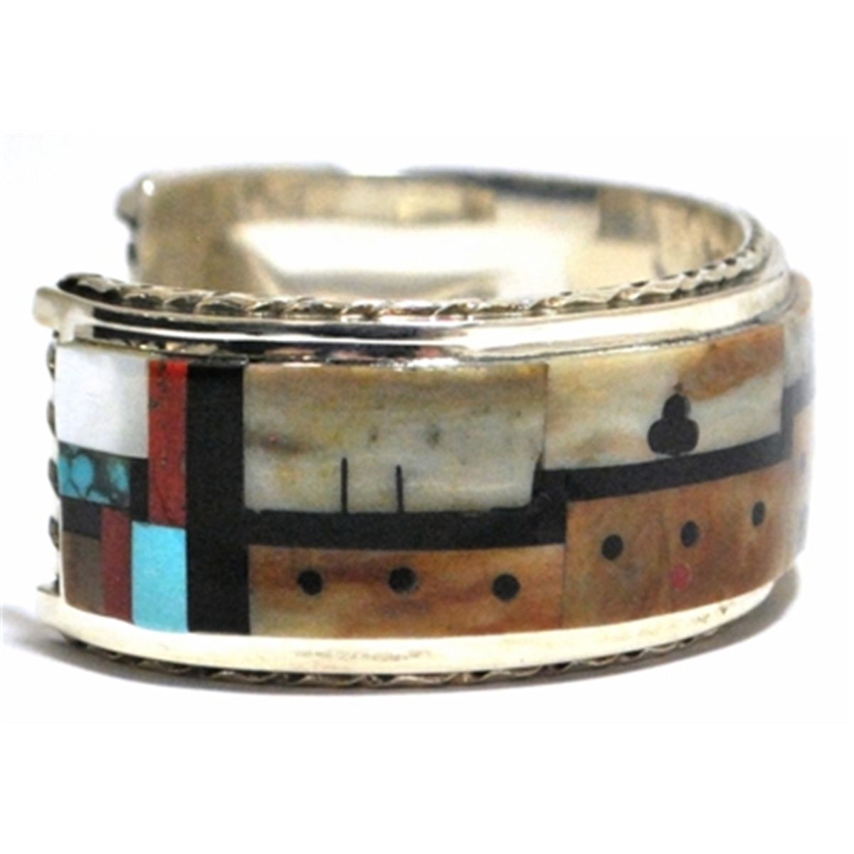 Measures 5-1/8" around with a 1-1/4" gap, 1" wide. Stones present: Coral, Turquoise, Kingman Turquoise, Mother of Pearl, Marble, Onyx.