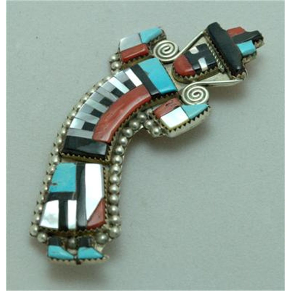 Measures 2-5/8" tall by 2-1/8" wide. Pin on back measures 1-3/8". Stones present: Mother of Pearl, Coral, Turquoise, Black Jet.