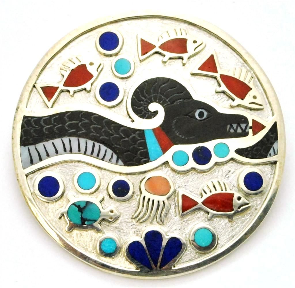 Zuni Multi-Stone Sea Serpent Sterling Silver Circle Pendant & Pin - Rudell & Nancy Laconsello