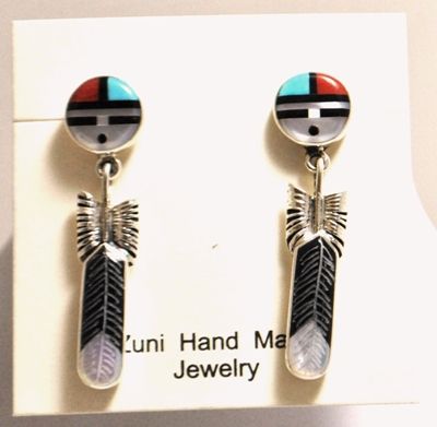Necklace measures 22" around. Eagle Dancer measures 2" tall by 1-3/8" wide. Feathers measure 1-1/2" tall by 3/8" wide. Spinner sections measure 5/8" tall by 5/8" wide. Earrings measure 1-7/8" tall by 1/2" wide. Stones present: Abalone, Mother of Pearl (White & Golden), Black Jet, Turquoise, Coral.