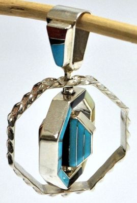 Measures 1-7/8" tall by 1-1/8" wide. Stones present: Coral, Turquoise, Black Jet, Mother of Pearl. All 4 pieces spin independently along the axis (see picture).