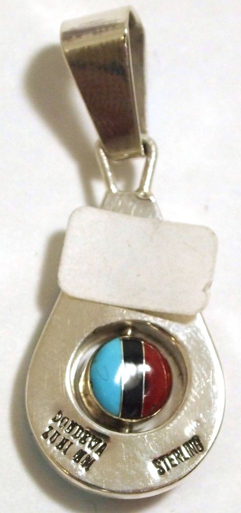 Measures 1-5/8" tall by 5/8" wide including bale. Bale opening measures 1/4". Sun face spinner measures 5/16" in diameter. Stones present: Mother of Pearl, Coral, Turquoise, Onyx.