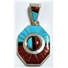 Measures 1-1/2" tall by 3/4" wide. Stones present: Coral, Turquoise, Black Jet, Mother of Pearl.