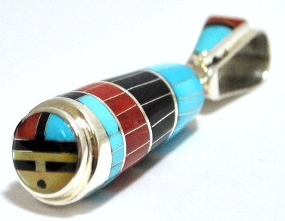 Measures 2" tall by 1/2" wide. Pendant rotates freely on bail. Stones present: Coral, Turquoise, Onyx, Golden Lipped Mother of Pearl.