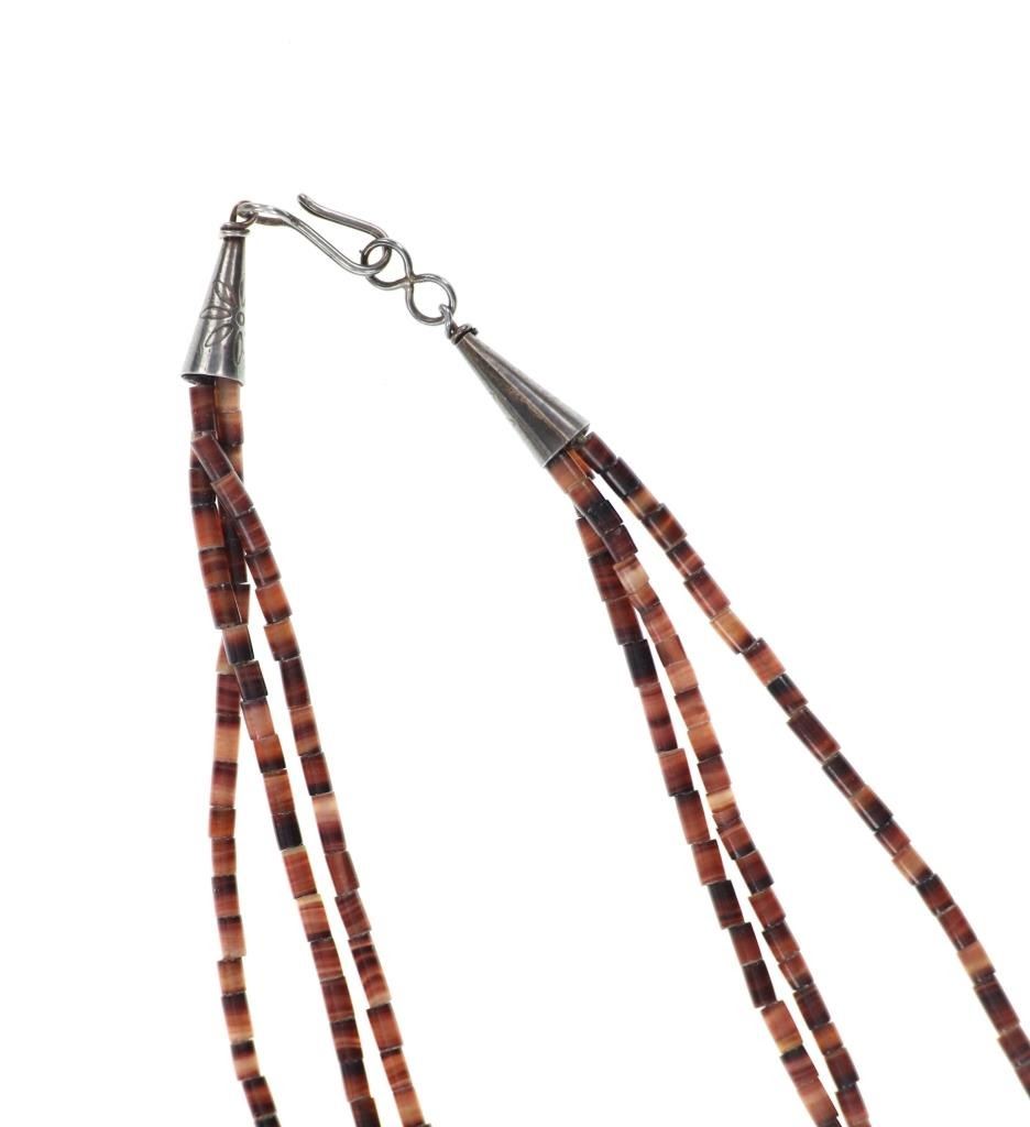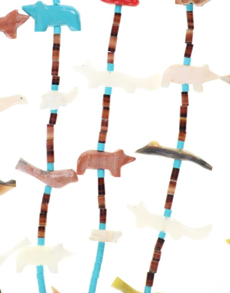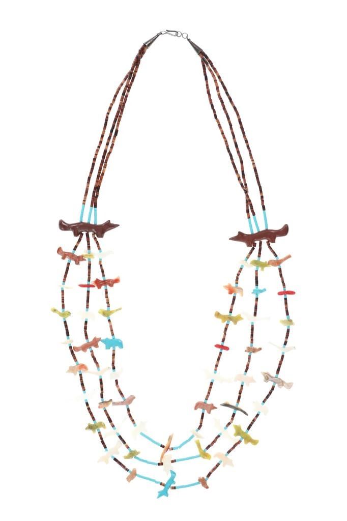 Featured in this lot is this Zuni multi-strand bird fetish necklace circa 1960's. Zuni Multi-Strand Bird Fetish Necklace with Heishi, Seed and Tube Beads, circa 1960s. Carving fetishes has been a part of the Zuni culture for hundreds of years. The art of carving decorative necklaces was first practiced by Pueblo and Zuni carvers. These necklaces are either one strand or multi-strands of strung together with a variety of small carved animal figures that are drilled and strung with shell or turquoise "heishi" beads. These bird or animal carvings may be as small as a half an inch or less. The fetish necklaces may be created by a single artist, a family of artists, or assembled by a group of artists who work together in a shop. Fetishes were originally carved by Native American tribes to ceremonially capture the spirit of the animal they represent. They were tied with offerings of shells, stones, or feathers, and were "fed" with corn pollen or other foods as an offering to the spirit of the fetish. The Zuni as well as other Pueblo tribes kept their fetishes in jars inside of their kivas, (a space used by Puebloans for rites and political meetings, many of them associated with the kachina belief system) and only brought them out only for specific ceremonies. The condition of this Zuni necklace is good with no obvious signs of damage and shows good overall condition. The measurements of this necklace from clasp to clasp is 26 1/2". The collective weight of this necklace from clasp to clasp is 49.7g.