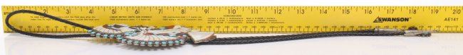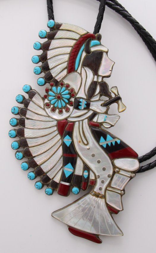 Zuni Native American Bola tie with silver and inlaid turquoise, mother of pearl, coral, and other precious stones. Chief ceremonial design. SIZE: see attached ruler photo. Photos are part of the description representing the condition report and can be used for authentication prior to the sale date. Pangaea Auctions urges Bidder's to view all attached photos in detail.