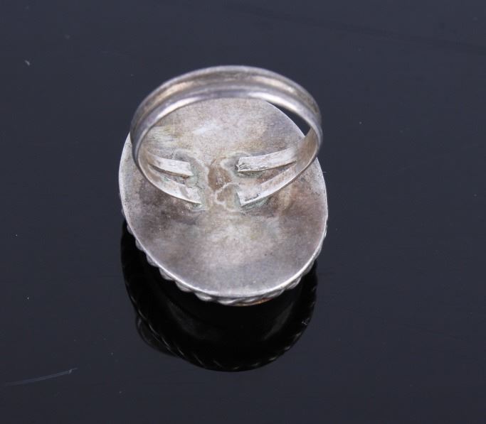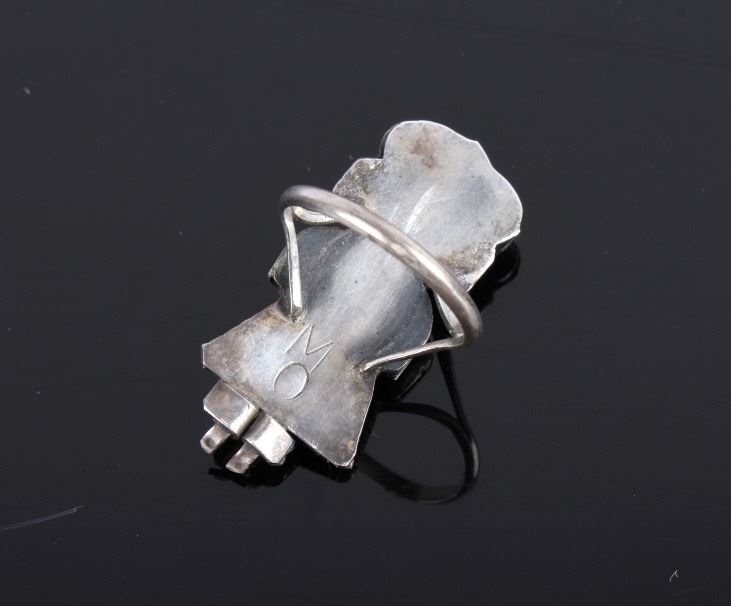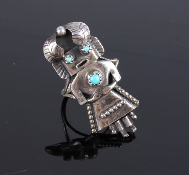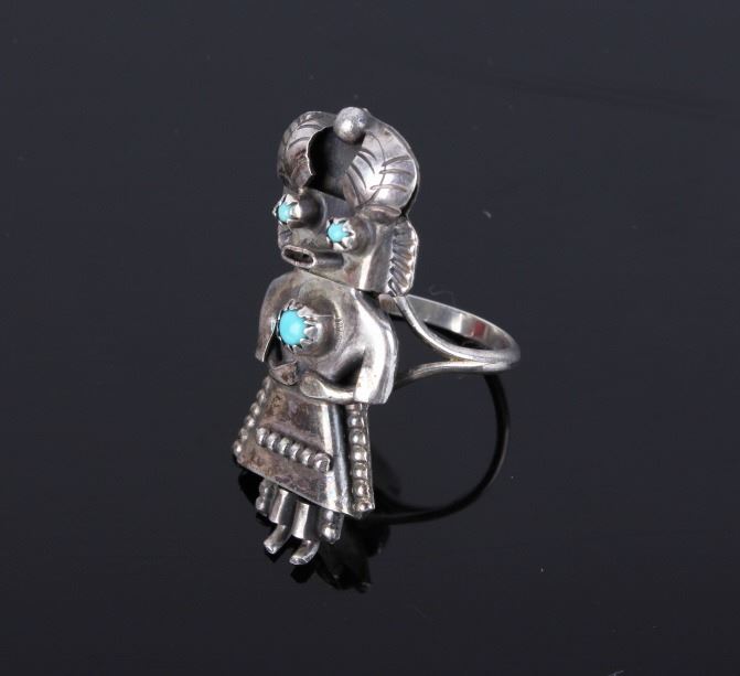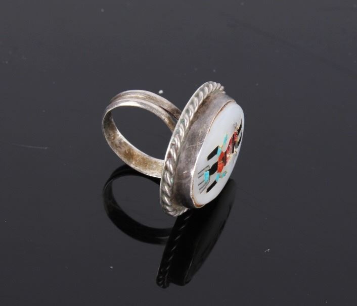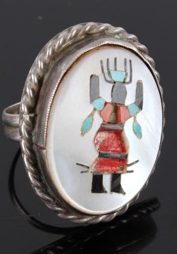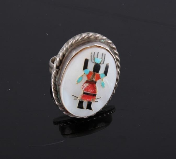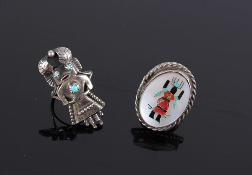 Included in this lot for auction is a signed Zuni Native American Indian ring set, comprised of two sterling silver rings. Each piece shows a Zuni Kachina. The first piece is a sterling silver Kachina ring with three bezel set turquoise and detailed silver work including beads and feathers. This piece is marked with an artist's hallmark "MC." The second piece in this collection is a multi stone Kachina including Mother of Pearl, turquoise, onyx, and branch coral all set in sterling silver base with twisted rope design around the edge. The center stones are missing from the Kachina and all other stones are in great condition. The first ring is a US Size 7" and the second ring is sized US 7 1/4"