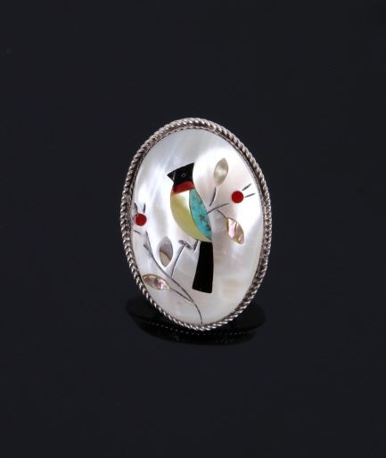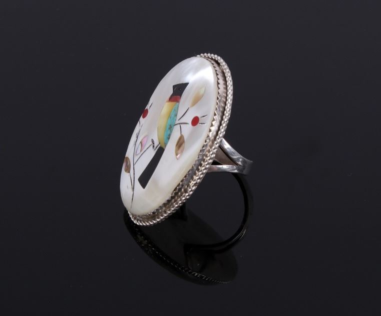 Available for your bidding pleasure we have this Zuni Native American Multi-Stone Mosaic Inlay Ring. This ring is composed of a mosaic of various stones including Mother of Pearl, Jet, Branch Coral, Abalone and Turquoise. These stones are formed together to create a detailed depiction of a bird perched on branches. The leaves on the branches are made of Abalone. This ring is firmly set in Silver and shows excellent condition. The ring measures a US size 10.