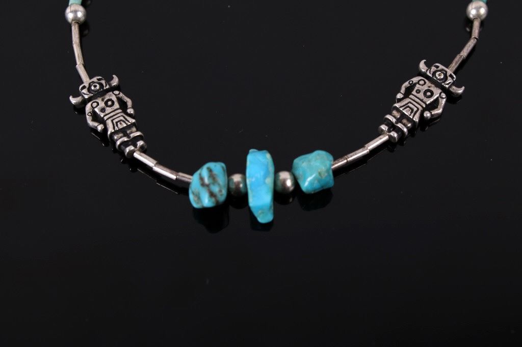 For your consideration is a Zuni Native American Sterling Silver fetish and Sleeping Beauty nugget necklaces. The first necklace features thirteen unique silver fetishes such as a dancing thunderbird and a buffalo figure. The second necklace also features buffalo figurines and three Sleeping Beauty Turquoise nuggets. Unclasped, the first necklace measures 23" and the second measures 20 1/2". Both necklaces are very unique and in good condition.