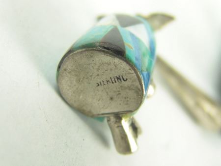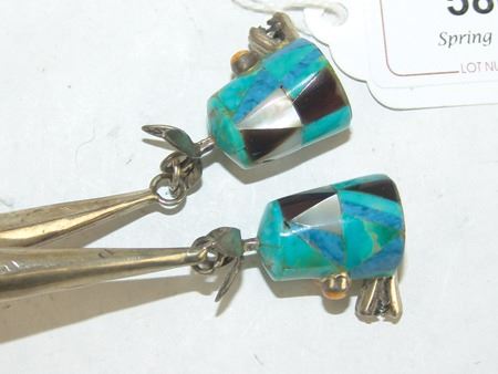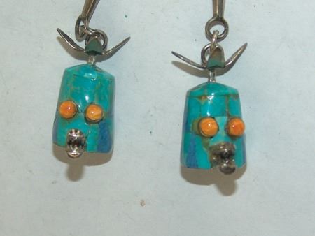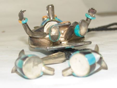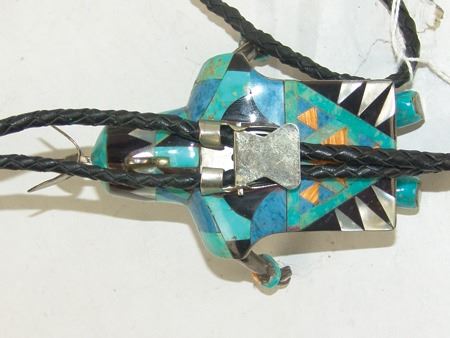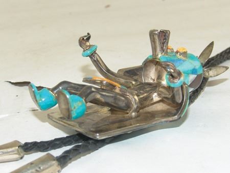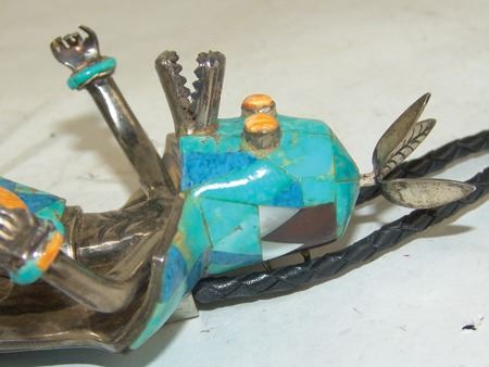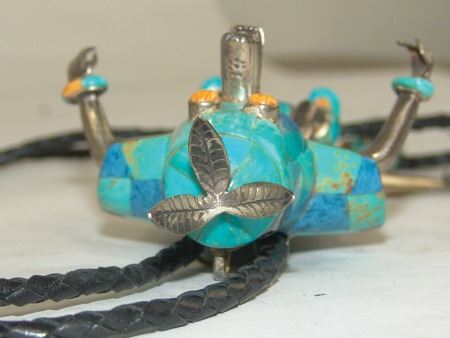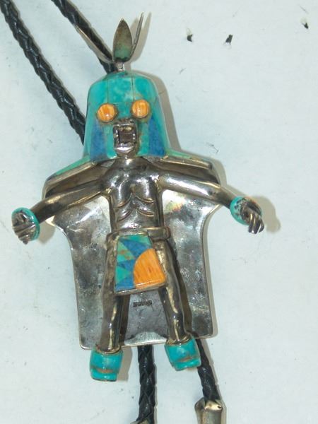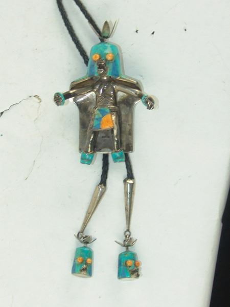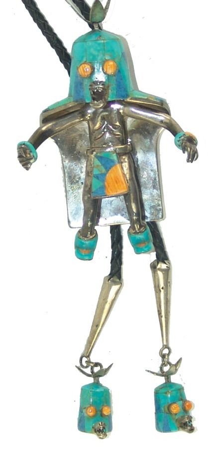 Ca. 1980s, Amazing original solid silver kachina figure, the cloak, headdress, kilt, kaibobs, and custom tips expertly overlaid with turquoise, spondulus, and other traditional stones. Very good condition. One of a kind! No signature found, unfortunately. **3/9/2016: This piece may have been misidentified in our original description. There is a possibility that it is an imported piece rather than actually Indian made. To be in compliance with the Indian Arts and Crafts Act of 1990, we have changed the description and added the word "style" to point out this possibility. Please examine this piece in person before bidding and use your own judgment. We apologize for any confusion. 46" long, bolo 4-1/8" x 2-3/4"