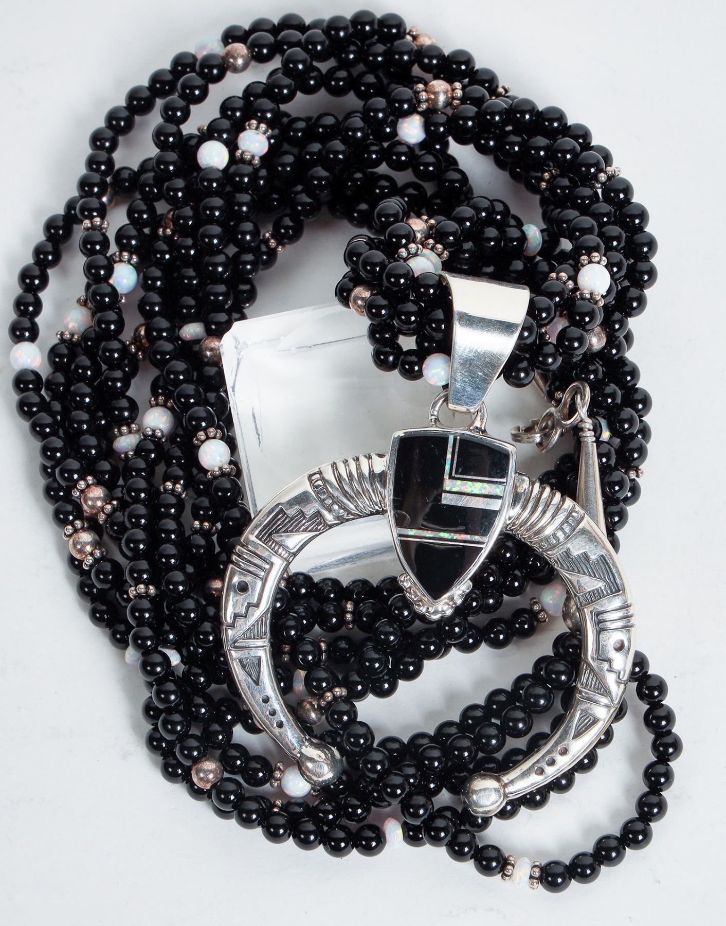 This is a Zuni made necklace with a sterling silver engraved Naja accented with a beautiful inlaid piece of black jet highlighted with opal, the pendant is suspended on a 5 strand 20î necklace with jet, opal and sterling silver beads, the Naja measures 2î x 2î. [] [] [] [] []