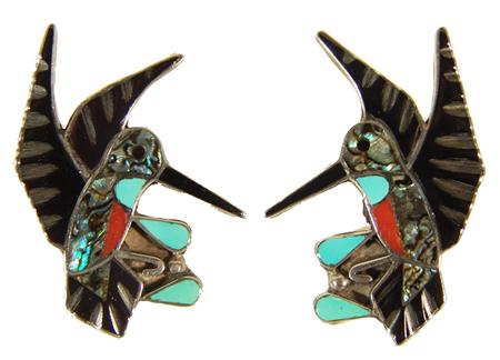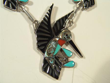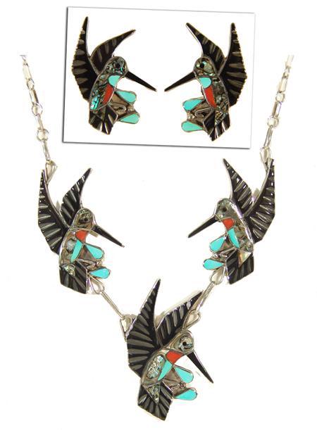 Exquisite hand wrought necklace with three channel work hummingbirds and matching pair of pierced earrings. Signed. 22" long, earrings 1-1/2"