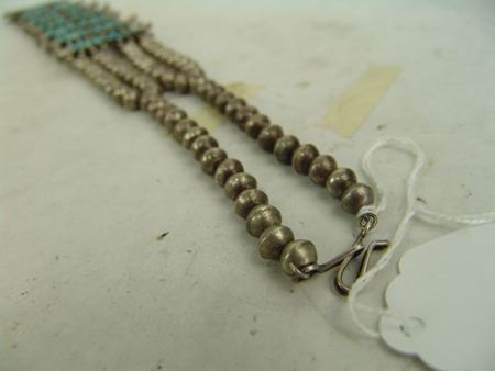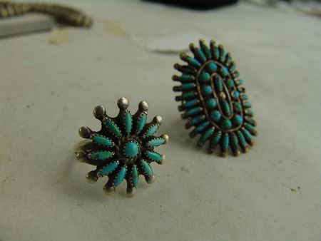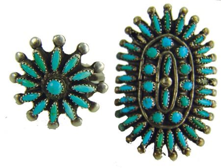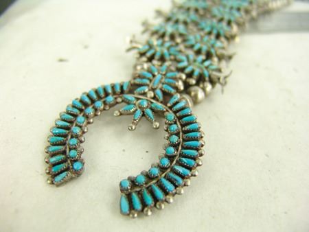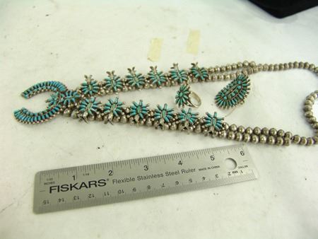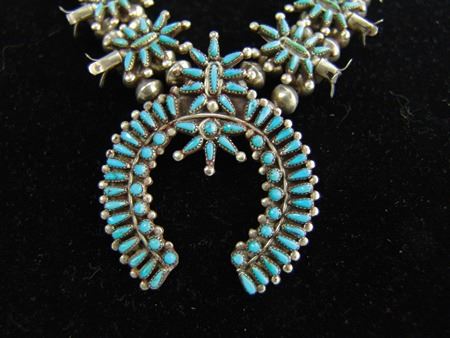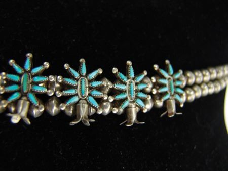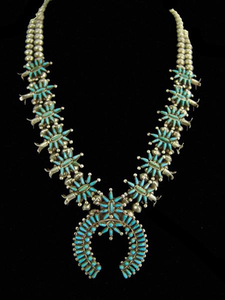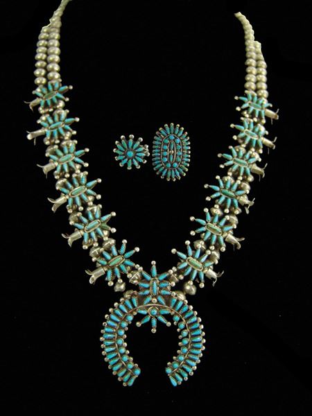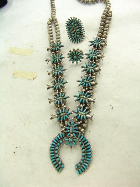 Ca. 1972, Fine classic petit point turquoise and silver squash blossom necklace and two matching rings (sizes 6 and 8-1/2) that have been worn together since purchased in 1972 at Allard Auctions. Very good condition, nice patina. Unsigned. 22", naja 2-1/4" x 2"