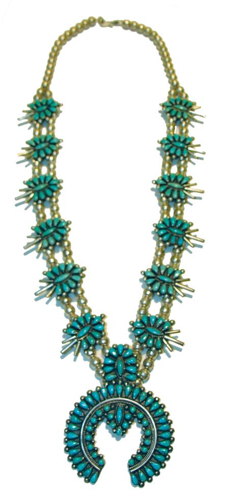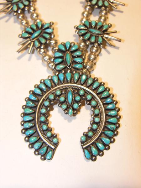 Circa 1964, Stunning Zuni squash blossom necklace with teardrop cluster turquoise stones, twelve turquoise blossoms, and crowned turquoise naja. 26" long, 3-1/4" x 2-1/4" naja