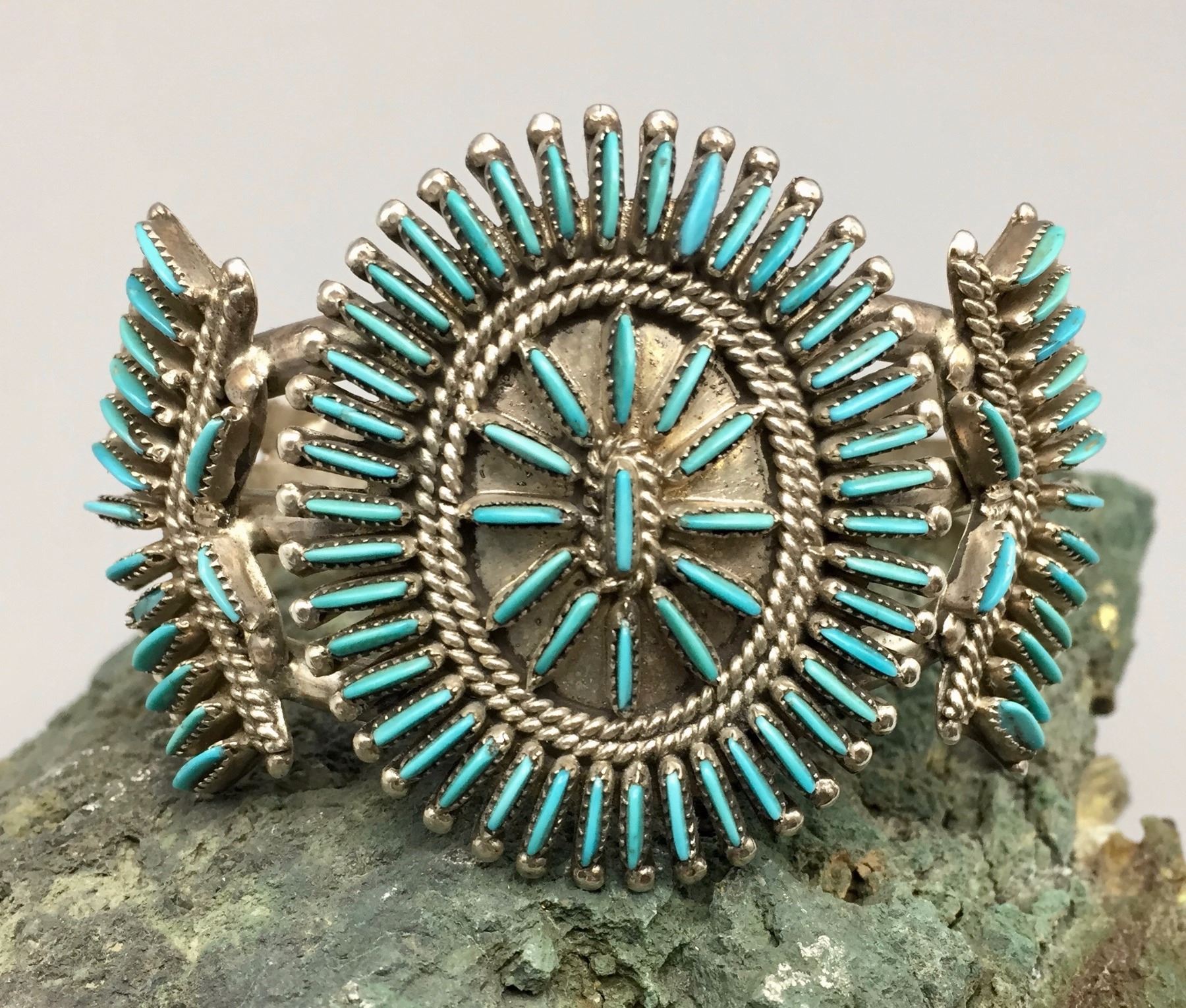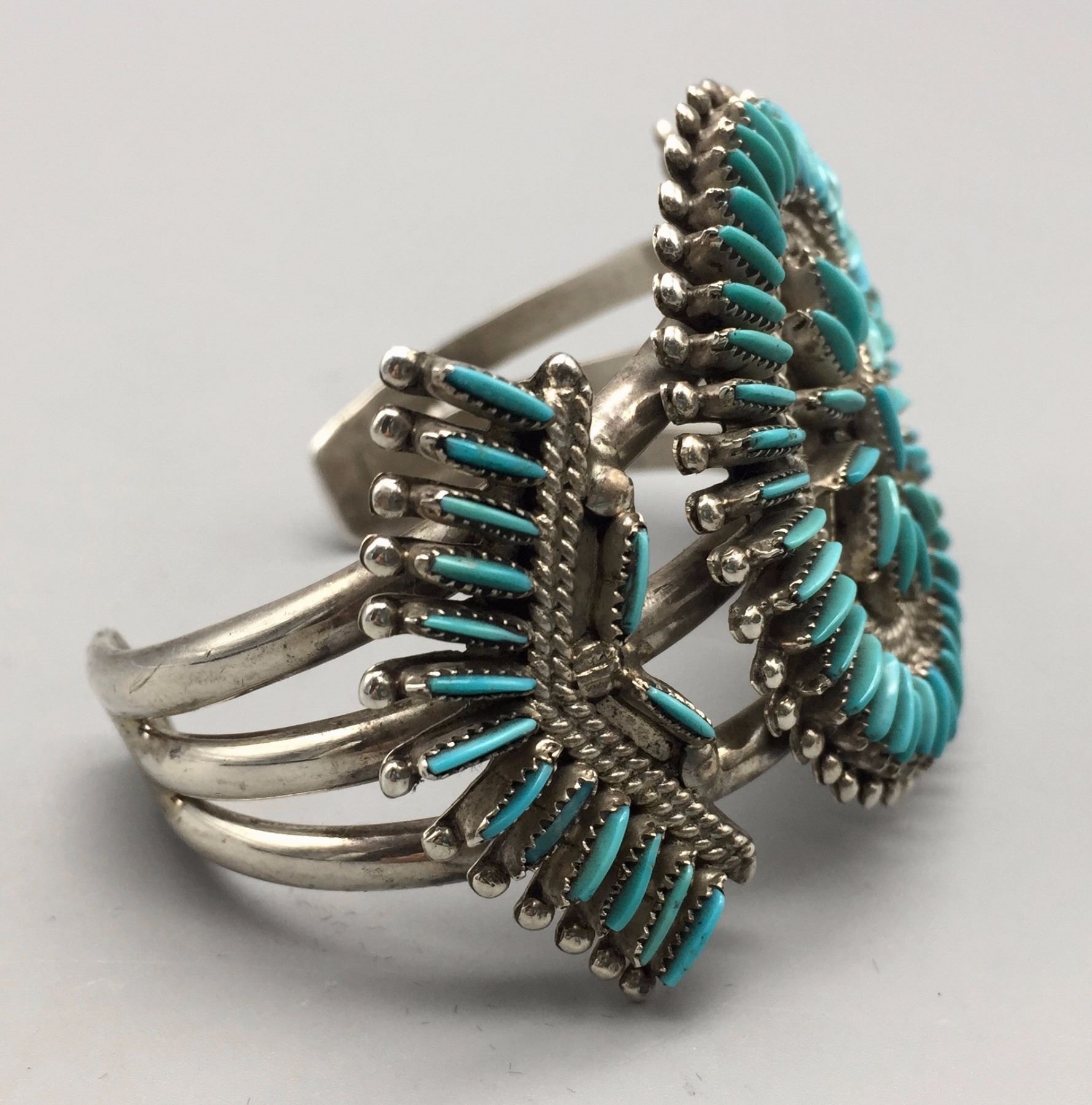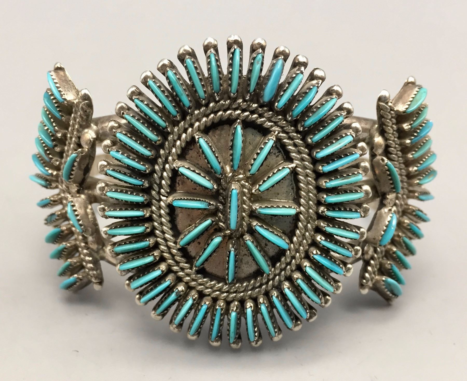 Maker: Hallmarked J.S. Bellson, mark of Shirley Bellson (Zuni). Approx. Age: Circa 1970s. Size: Inside circumference of bracelet is 5 1/8” plus it has a 1 1/8” opening (making it fit a 6 1/4” wrist). Bracelet is 1 3/4” at it’s widest point and weighs 53.8 g. Additional Info: Nice turquoise needlepoint design in sterling silver cuff. Condition: Good, normal wear expected. Please look closely at the pictures - they are an important part of our description. Shipping: There will be a $5 handling / packaging fee for shipping this lot. The actual cost of postage will be added on top of that.