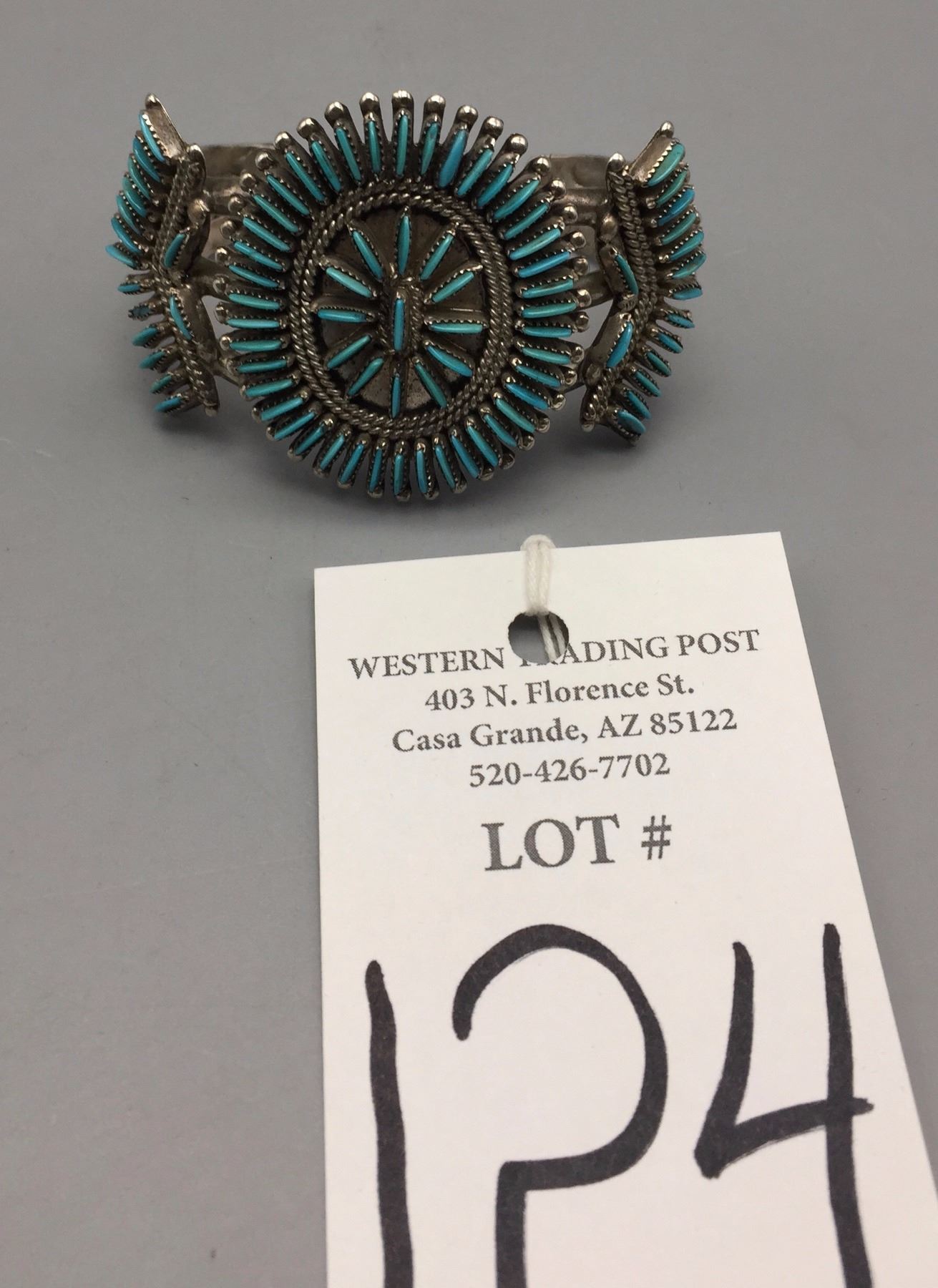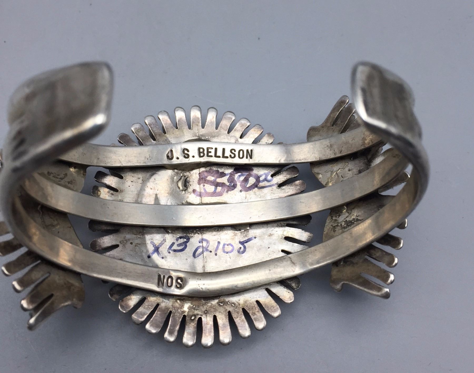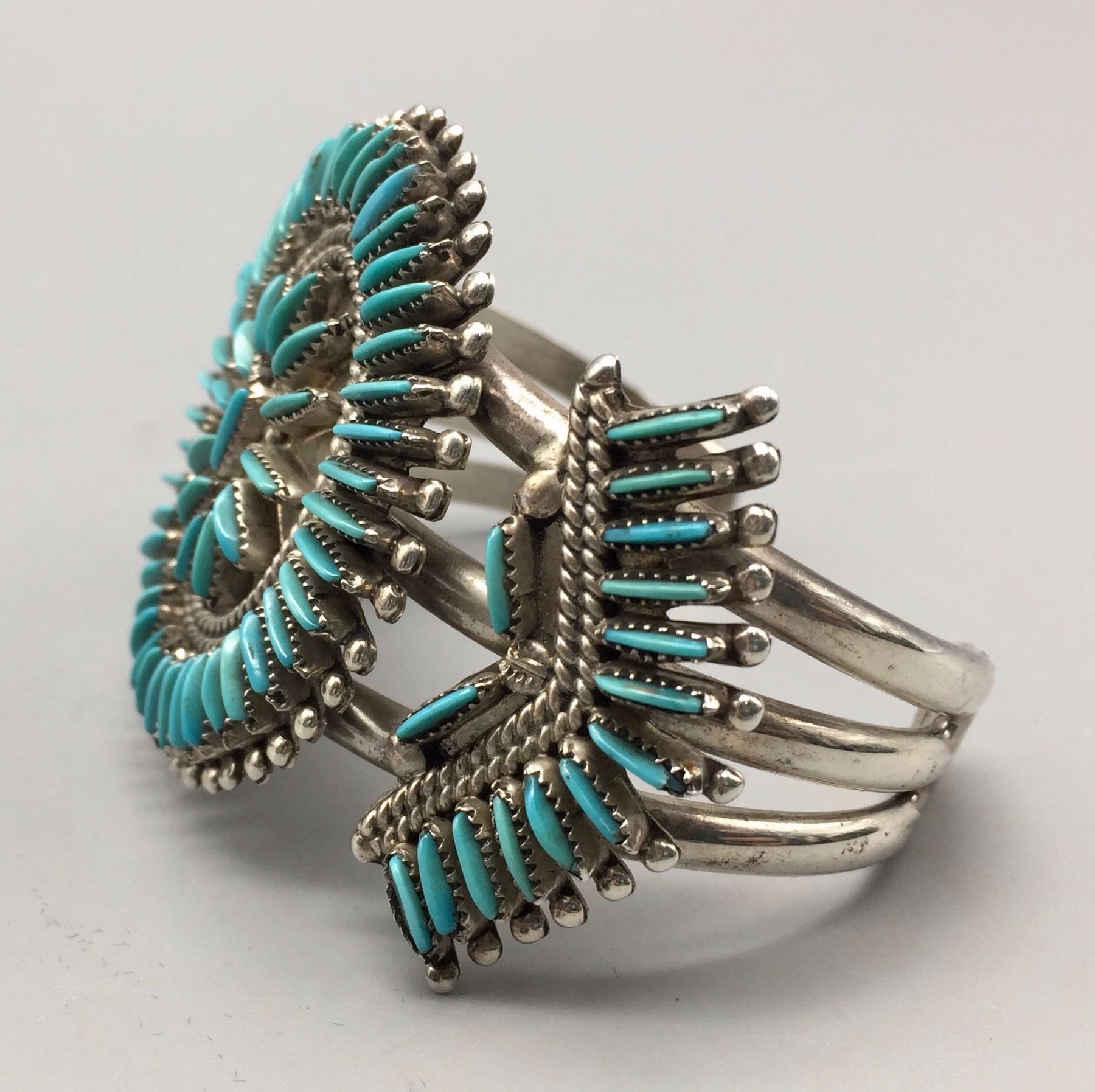 Maker: Hallmarked J.S. Bellson, mark of Shirley Bellson (Zuni). Approx. Age: Circa 1970s. Size: Inside circumference of bracelet is 5 1/8” plus it has a 1 1/8” opening (making it fit a 6 1/4” wrist). Bracelet is 1 3/4” at it’s widest point and weighs 53.8 g. Additional Info: Nice turquoise needlepoint design in sterling silver cuff. Condition: Good, normal wear expected. Please look closely at the pictures - they are an important part of our description. Shipping: There will be a $5 handling / packaging fee for shipping this lot. The actual cost of postage will be added on top of that.