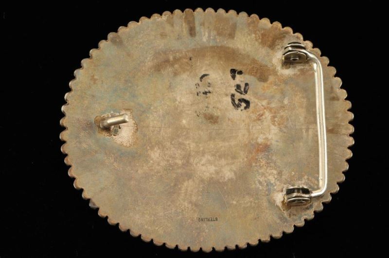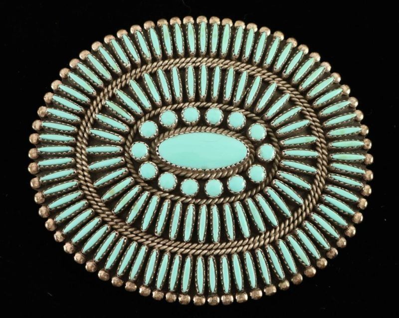Oval of sterling silver holds a lovely Zuni needlepoint cluster measuring 3 3/8"x2 7/8". Marked 'Sterling'.