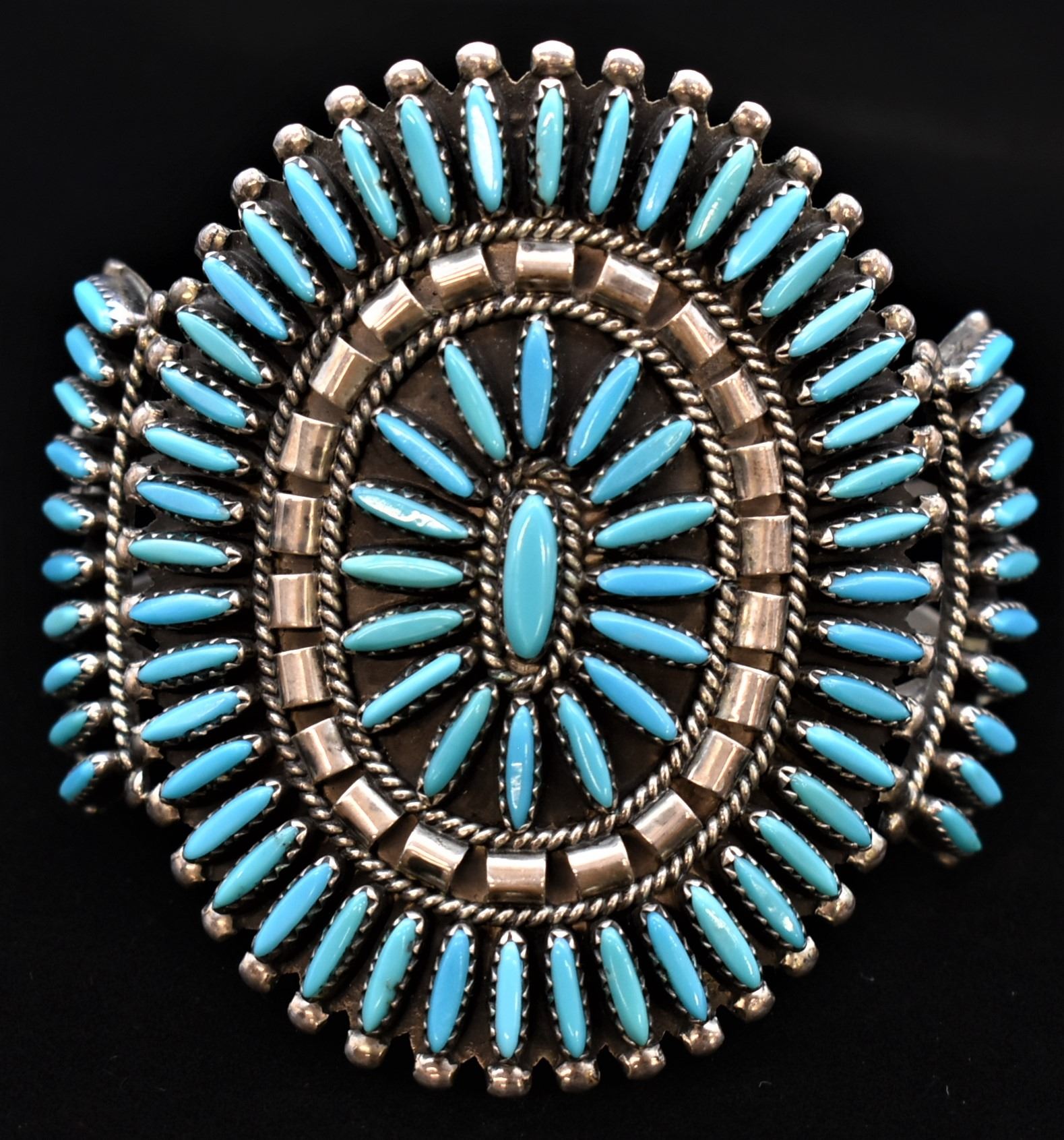 Historic Native American Zuni Needlepoint Turquoise Cluster Cuff Bracelet, beautiful Sleeping Beauty Turquoise, inside measures 8'' which includes the gap x 2.75''W, double shank, total gram wt. of 52.5, possible artist Dan Etspic, gorgeous older bracelet