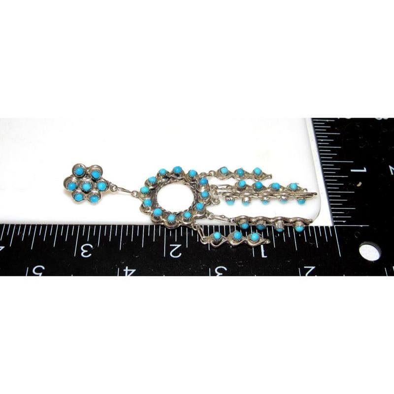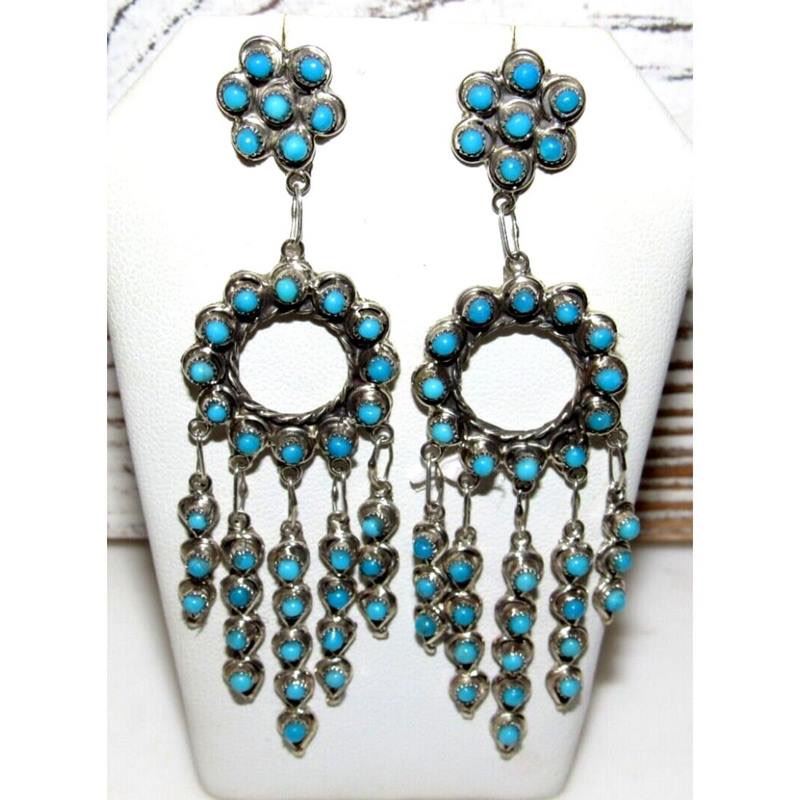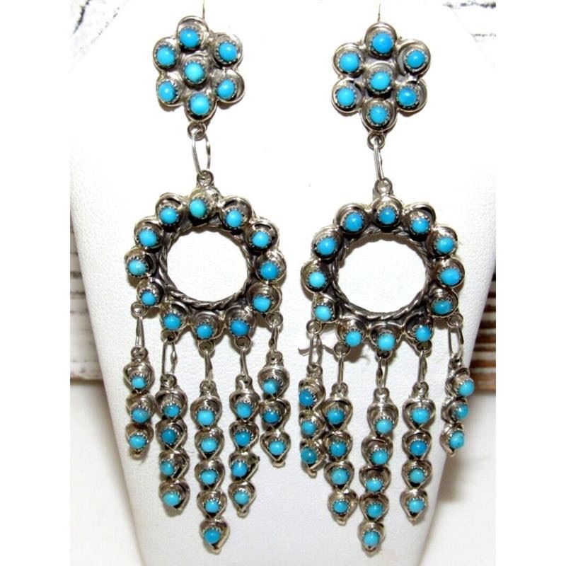 Stunning Zuni sterling silver and needlepoint turquoise dangle statement cascading earrings. The earrings impressively measure about 3.5" long and weigh about 18g total weight for both. Stunning craftsmanship and attention to detail. Post dangle style. Fab authentic Native American Navajo statement dangle earrings to add to any jewelry collection!