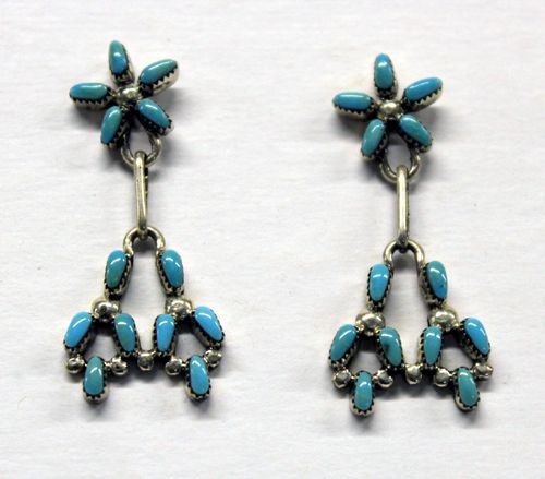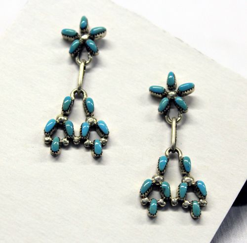 Zuni Needlepoint Turquoise & Silver Earrings. Beautifully crafted sky blue turquoise set in the needlepoint style with sterling silver. Vintage pieces, not marked, measuring 1 1/2''. Post style with five petals and eight stones set in the pendulums.