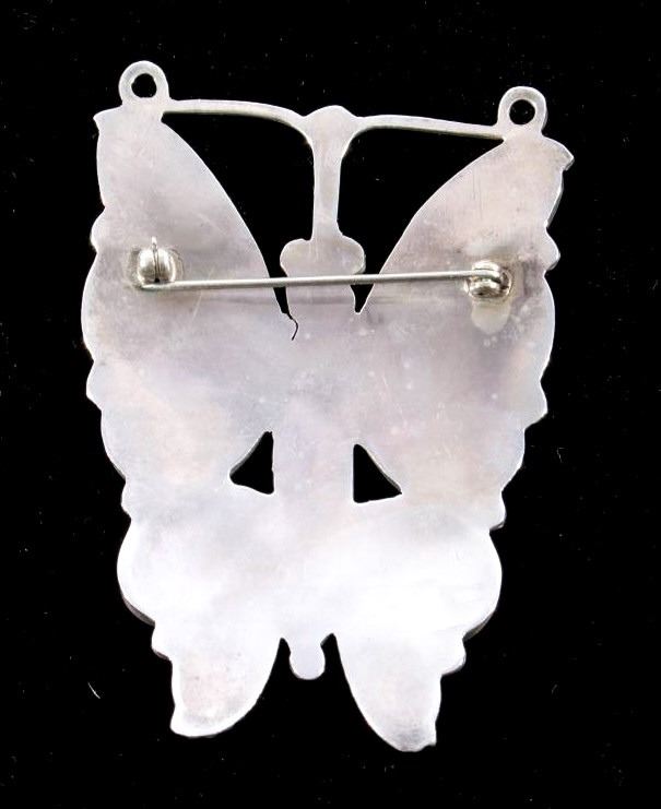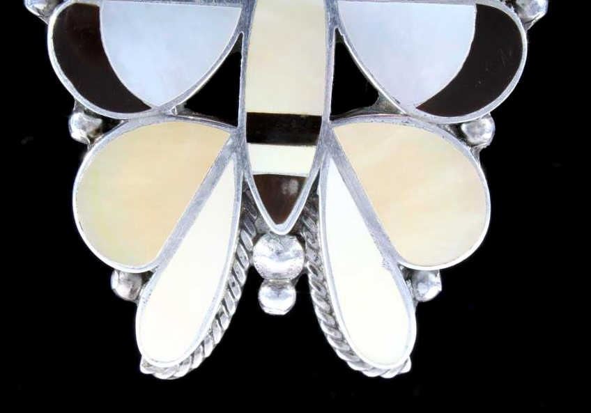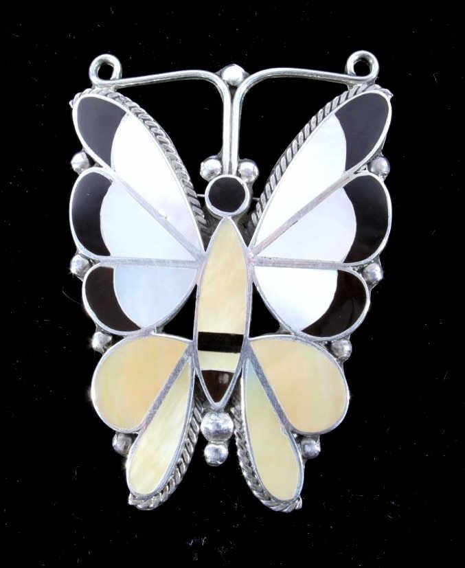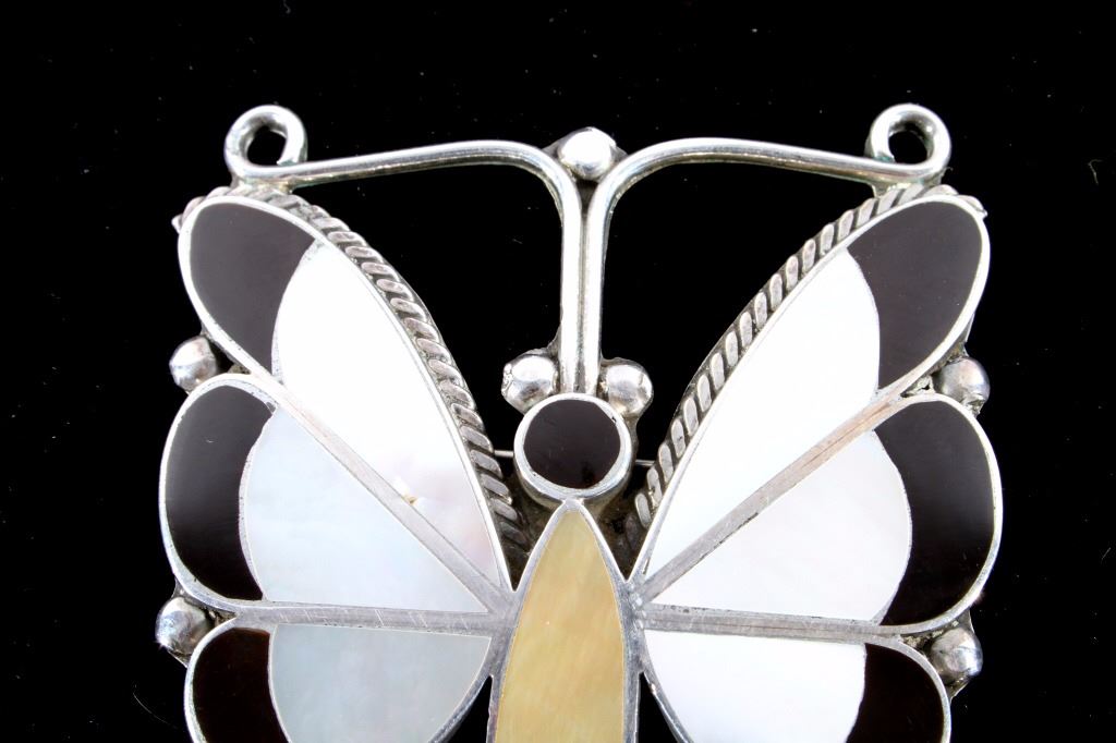 This is a Zuni Native American Indian inlaid mosaic butterfly effigy brooch or pin. The old pawn piece shows a sterling silver construction with excellent mother of pearl and black onyx inlaid stones. The large piece shows wonderful craftsmanship and quality. Measures 2"x2 7/8".