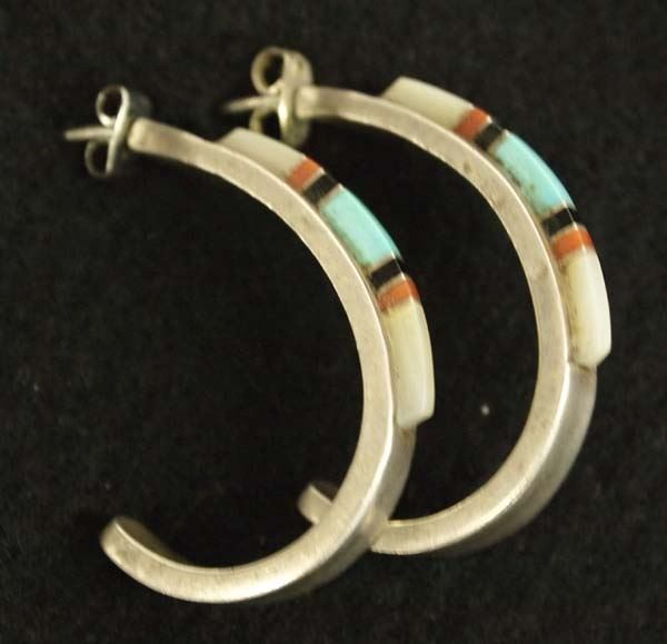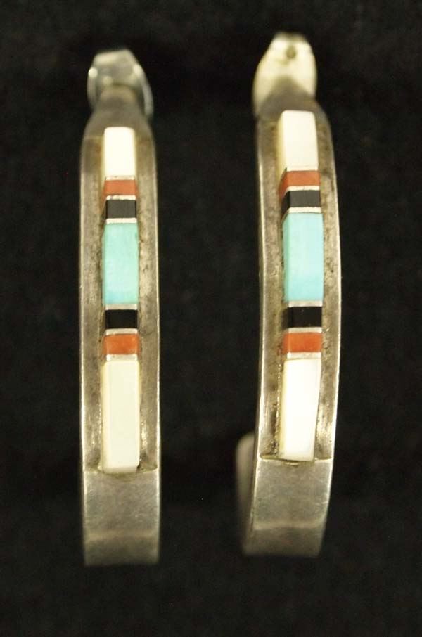 Native American Zuni Old Pawn Sterling Channel Inlay Hoop Earrings, measure 1.5''L x 1/8''W, inlay includes turquoise, mother of pearl, jet, and coral, stunningly gorgeous, 9.7g in total wt.