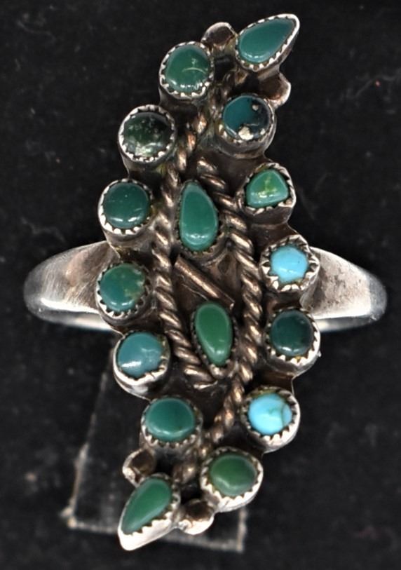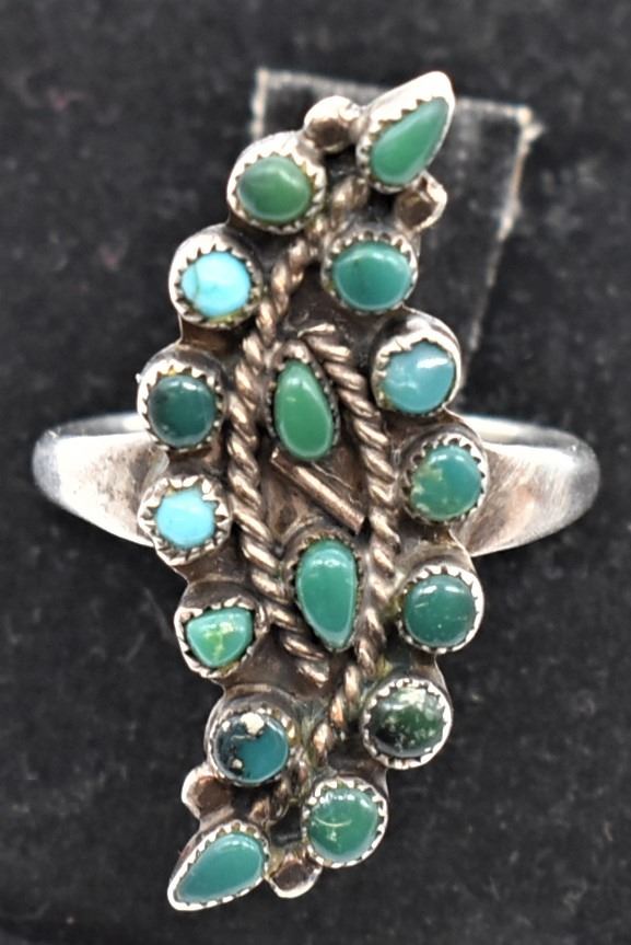 Native American Zuni Old Pawn Sterling Turquoise Ring, Size 9, measures 1.25'' x .5''W, features gorgeous aged blue green turquoise