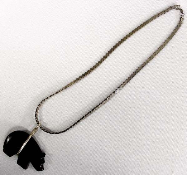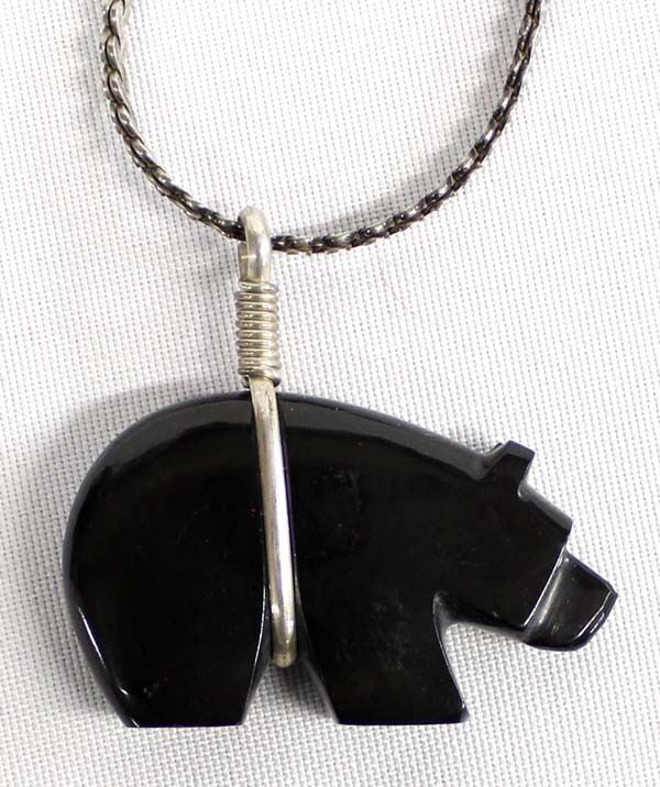 Native American Zuni Onyx Bear Fetish Pendant Necklace, turquoise eyes, pendant measures 2'' x 1'', Italian sterling silver chain measures 13''L end to end and is stamped, nice weight on this pendant necklace