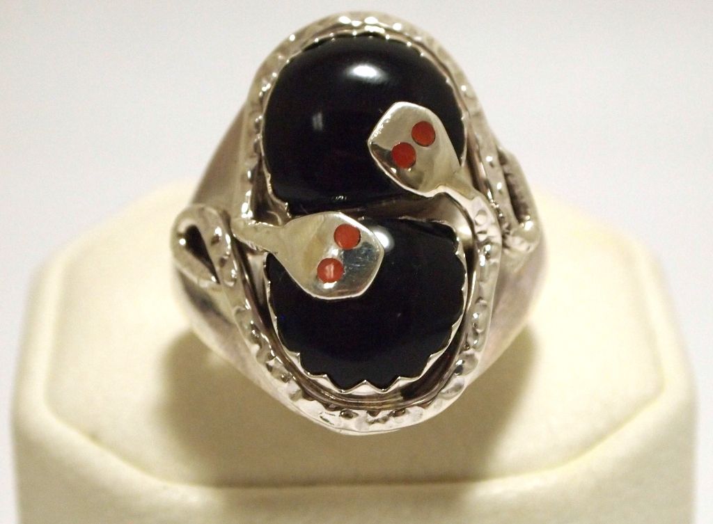Zuni Onyx & Coral Sterling Silver Snake Men's Ring - Effie Calavaza