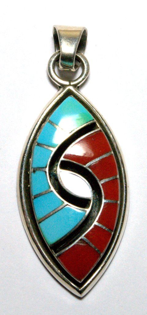 Zuni Onyx, Coral and Turquoise Sharp Oval Pendant - Amy Quandelacy
