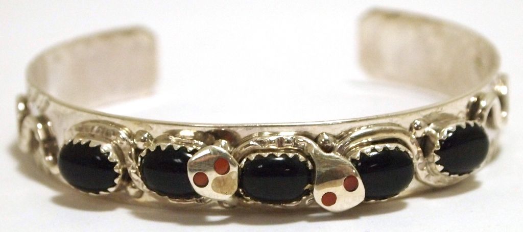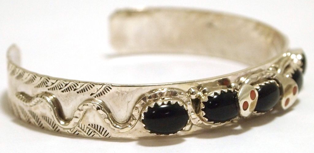 Zuni Onyx Sterling Silver Coral-Eyed Snake Cuff Bracelet - Effie Calavaza