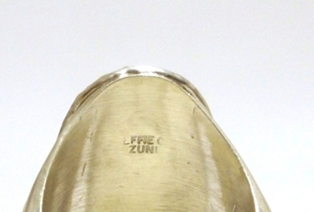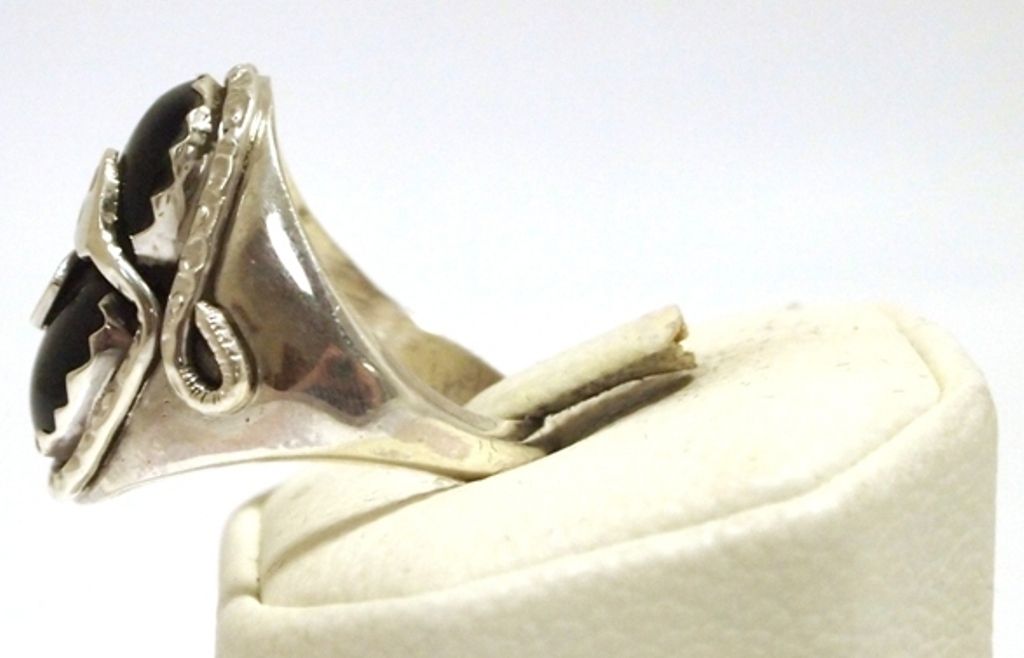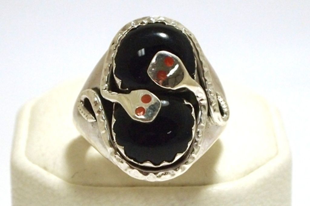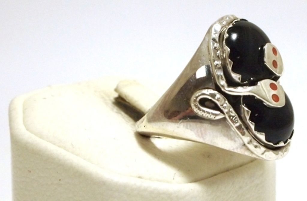 Zuni Onyx Sterling Silver Snake w/Coral Eyes Men's Ring - Effie Calavaza