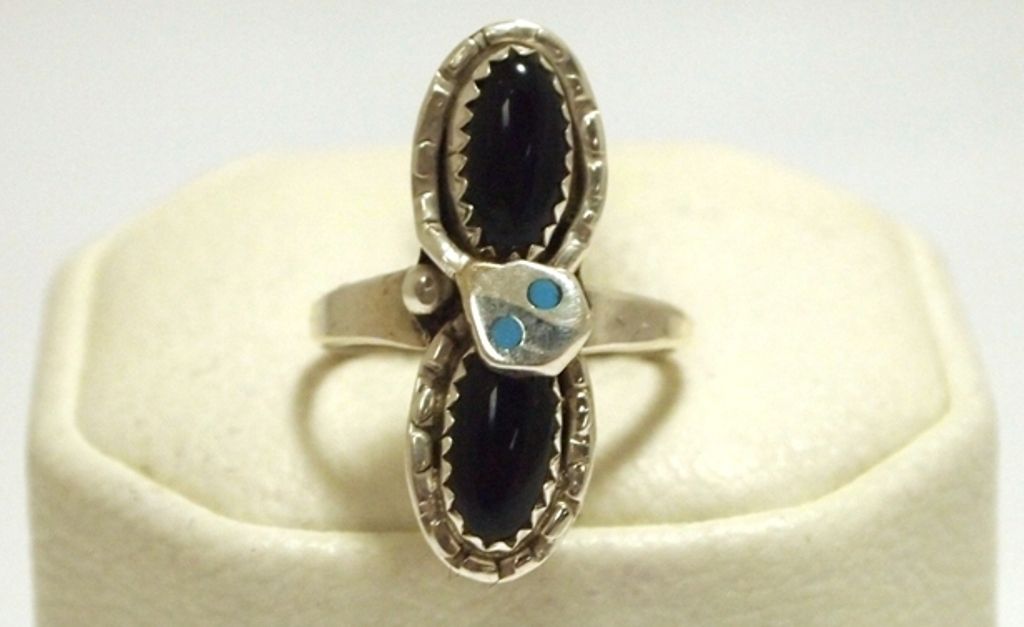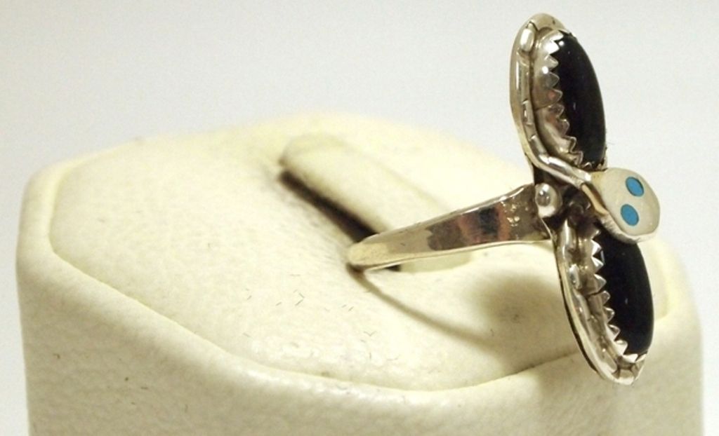 Zuni Onyx Sterling Silver Snake w/Turquoise Eyes Women's Ring - Effie Calavaza