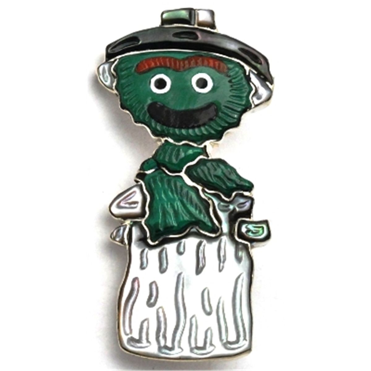 Measures 2" tall by 1" wide. Pin on back measures 1-1/4". Stones: Malachite, Pipestone, White Mother of Pearl, Black Jet.