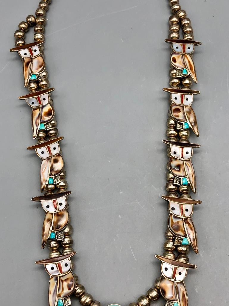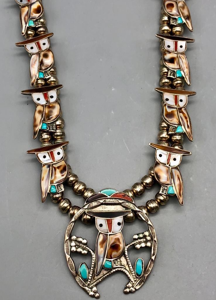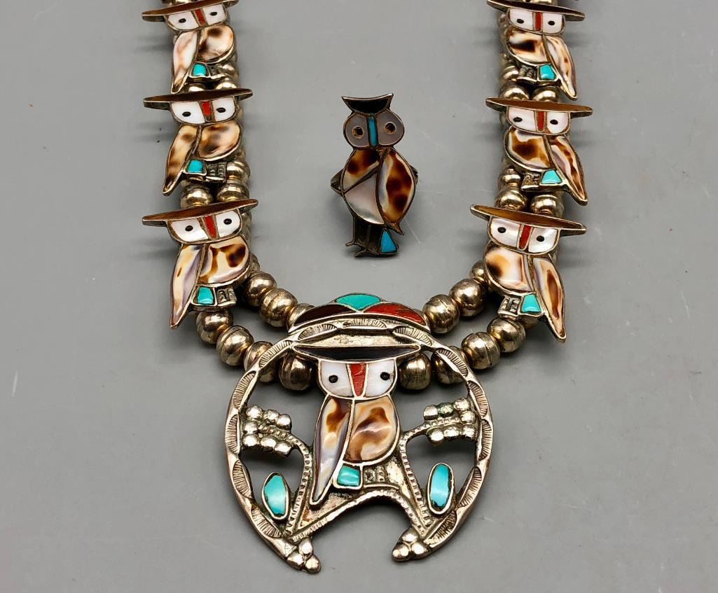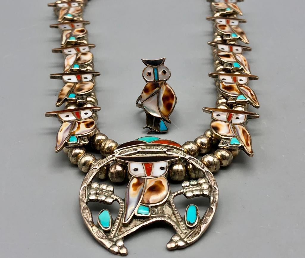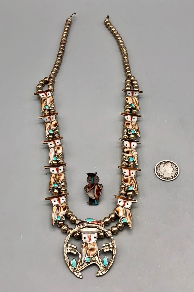 Up for consideration is this Zuni inlay necklace and ring set. This is a beautiful set with fun owl motifs. The ring and necklace are set with shell, coral and turquoise. The pendant has some hand stamped designs, with hand soldered beads. It is made from sterling silver. MAKER: Hallmarked PW NATEWA ZUNI NM, Pitkin Natewa, (1934-; Zuni). Active Since the 1950s. APPROX AGE: Circa 1950s. SIZE: Necklace fits a 24 inch neck. Pendant measures 2-1/8 inches long X 1-7/8 inches wide. Ring is a size 5.5. Combined weight is 101 grams. CONDITION: Good for its age, normal wear expected. Please look closely at the pictures as they are an important part of our description and are hereby incorporated into the description, specifically with regards to condition. SHIPPING: There will be a $5 handling / packaging fee for shipping this lot. The actual cost of postage will be added on top of that. BUY IT NOW: If you would like to buy this item now, without waiting for the auction day to bid on it, we do offer this option (which is available up to 48 hours before the actual auction starts). The “Buy it Now” price is the high estimate of this lot (plus applicable fees and the Buyer's premium is discounted to 10% when using the Buy it Now option). If you would like to exercise this option, you must contact us by email (or phone as long as you talk to someone live). Reference this lot number and your intention to "Buy it Now."