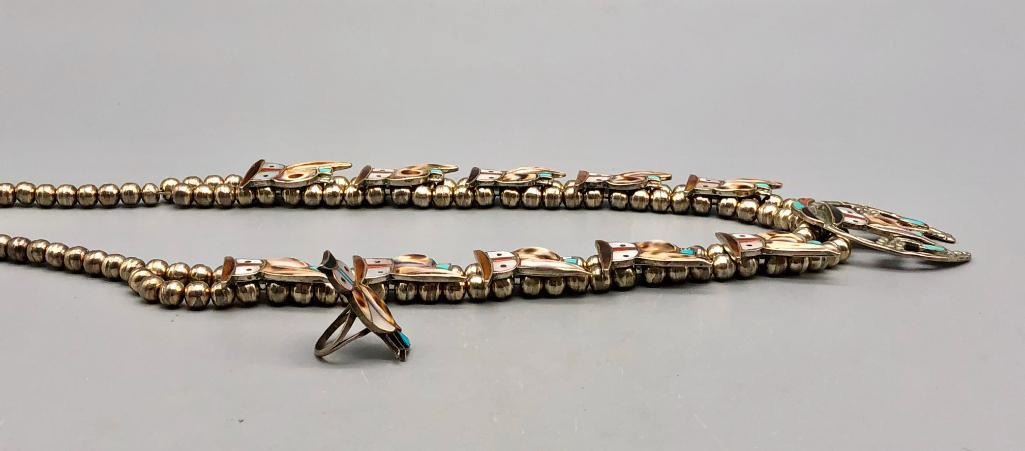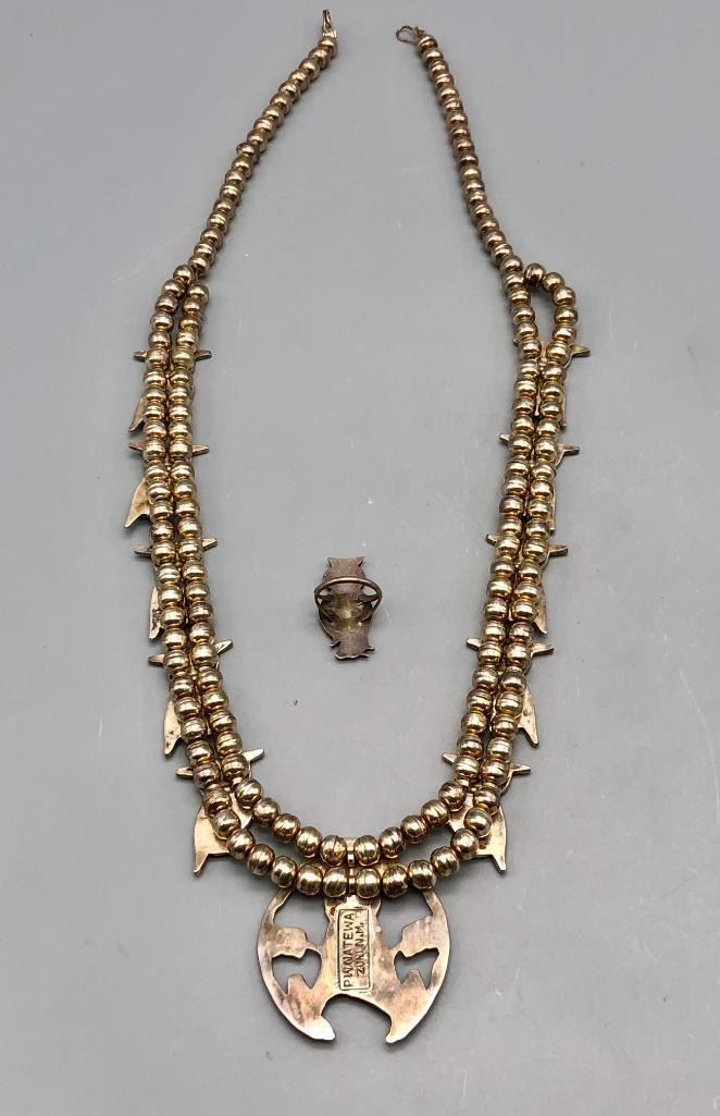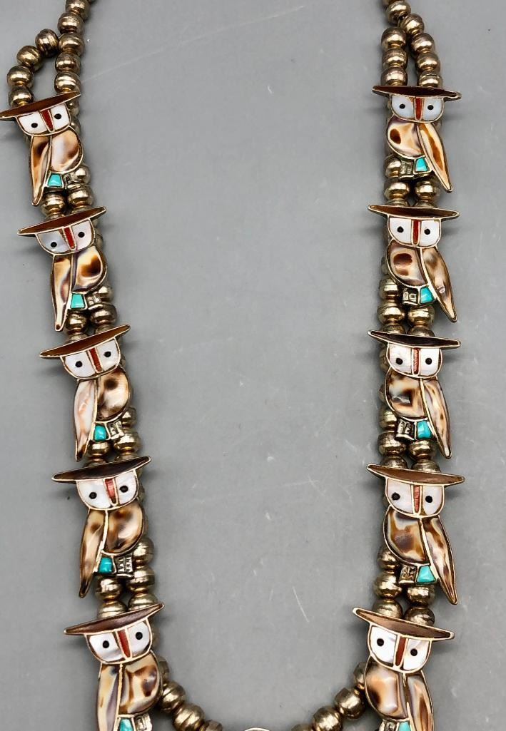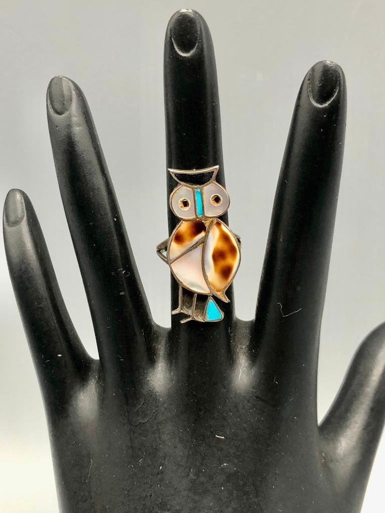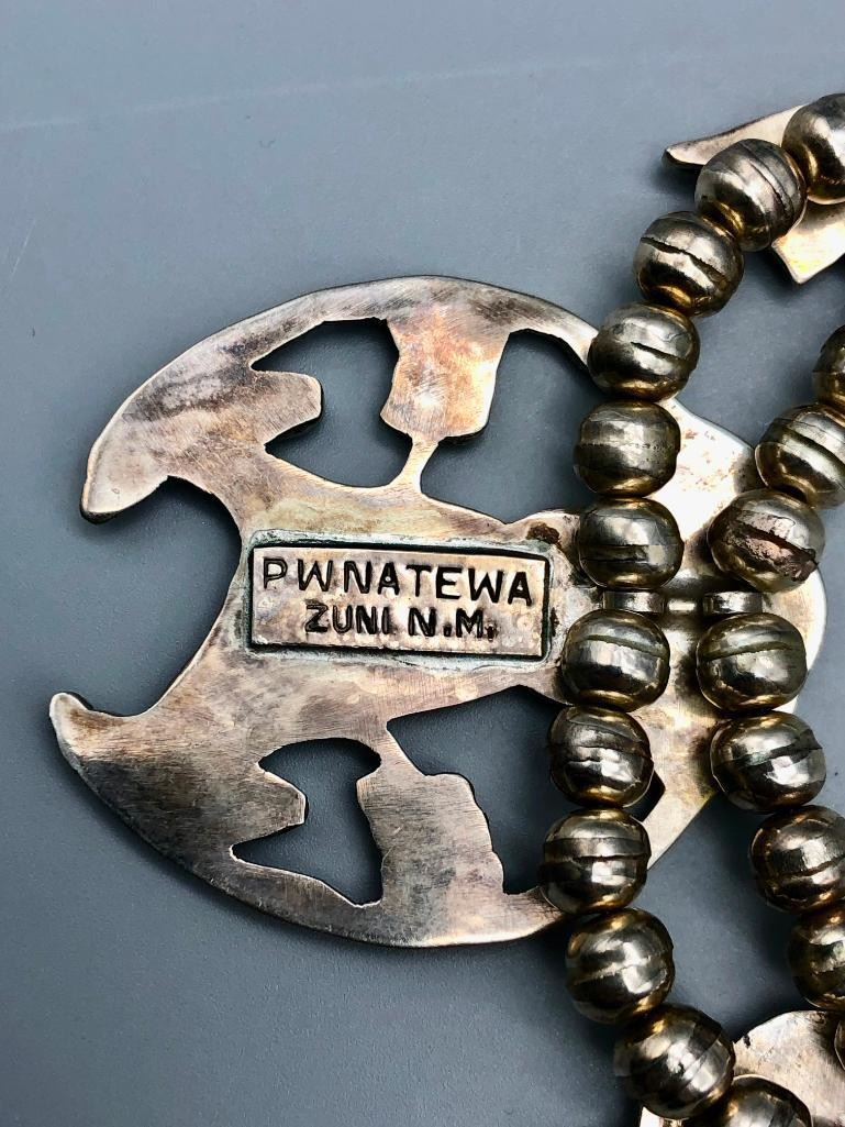 Up for consideration is this Zuni inlay necklace and ring set. This is a beautiful set with fun owl motifs. The ring and necklace are set with shell, coral and turquoise. The pendant has some hand stamped designs, with hand soldered beads. It is made from sterling silver. MAKER: Hallmarked PW NATEWA ZUNI NM, Pitkin Natewa, (1934-; Zuni). Active Since the 1950s. APPROX AGE: Circa 1950s. SIZE: Necklace fits a 24 inch neck. Pendant measures 2-1/8 inches long X 1-7/8 inches wide. Ring is a size 5.5. Combined weight is 101 grams. CONDITION: Good for its age, normal wear expected. Please look closely at the pictures as they are an important part of our description and are hereby incorporated into the description, specifically with regards to condition. SHIPPING: There will be a $5 handling / packaging fee for shipping this lot. The actual cost of postage will be added on top of that. BUY IT NOW: If you would like to buy this item now, without waiting for the auction day to bid on it, we do offer this option (which is available up to 48 hours before the actual auction starts). The “Buy it Now” price is the high estimate of this lot (plus applicable fees and the Buyer's premium is discounted to 10% when using the Buy it Now option). If you would like to exercise this option, you must contact us by email (or phone as long as you talk to someone live). Reference this lot number and your intention to "Buy it Now."