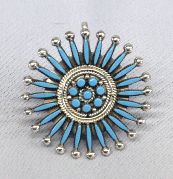 Native American Zuni Petit Point Turquoise Pin/Pendant by Booqua. Sun-burst style petit point turquoise stones surround a central focal point of 8 round stones. This can be worn as a pin or a pendant. It is signed by the artist ''I(rene) Booqua'' ''Zuni''.