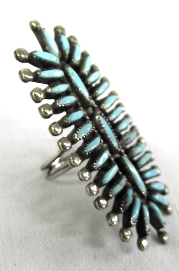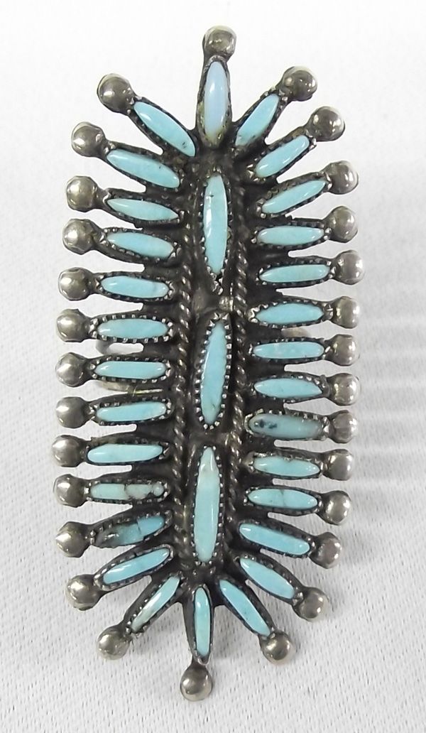 Zuni Petit Point Turquoise Ring. Very unusual and stunning ring with over 30 tiny turquoise nuggets. Sterling silver balls on tip of spines and all sterling setting. Size 7, 2.25''L x 1''W.