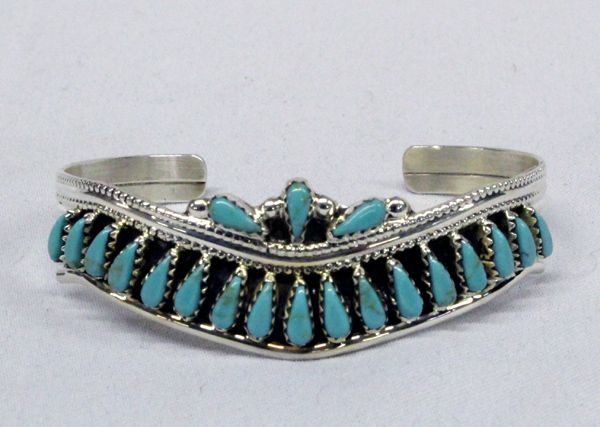 Native American Zuni Petit Point Turquoise & Sterling Bracelet. Tear drop shaped petit point turquoise stones on this two banded sterling bracelet provides an interesting design element. Three stones are set at the top of the piece which offset the bands of stones. It has a hallmark ''S'' and stamped ''Sterling'', measuring 6 3/4'', including opening and 7/8'' in width.