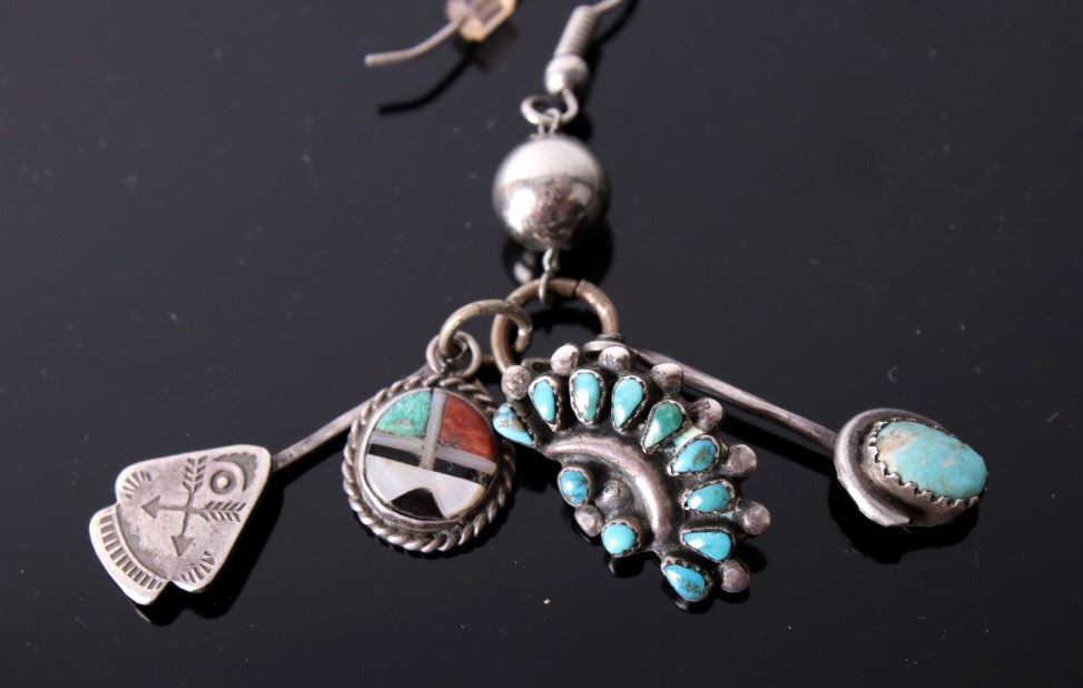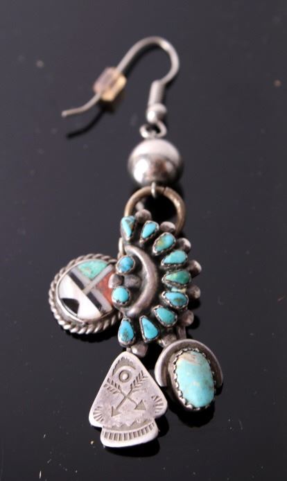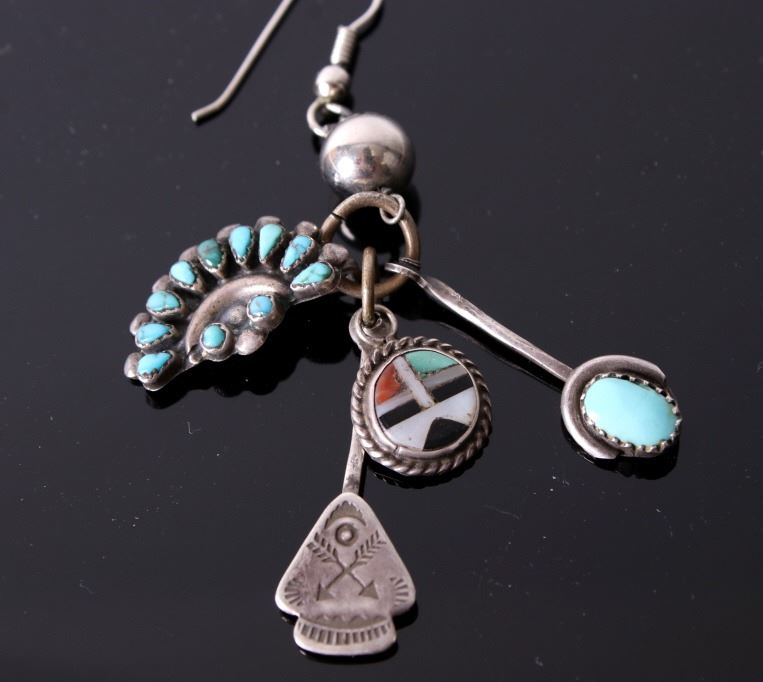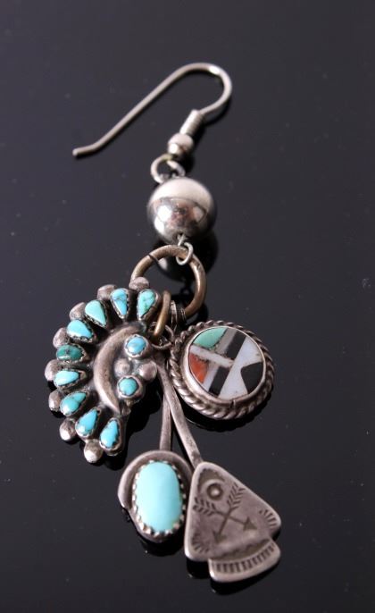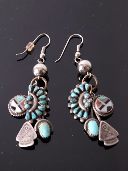 For your bidding pleasure are a pair of Zuni petite point and sun face inlay charm earrings. These sterling silver earrings showcase four unique charms. The first is an inlaid Sun Face featuring turquoise, branch coral, mother of pearl and onyx gemstones. The second is a finely detailed petite point design. The third is a hand stamped sterling arrow head and last is a solitary sleeping beauty turquoise cabochon. The earrings measure 2 3/4" long.
