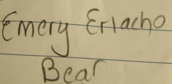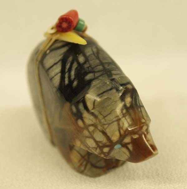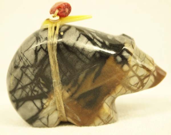 Zuni Picasso Marble Bear Fetish by Emery Eriacho, measures 2'' x 1.5'', turquoise eyes, gold lip shell arrowhead and turquoise/coral bead powerpack