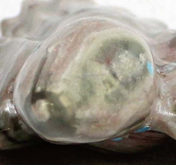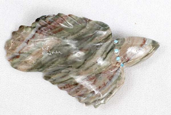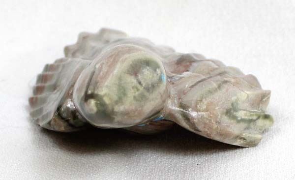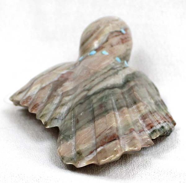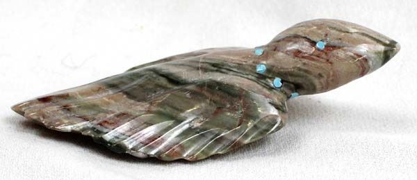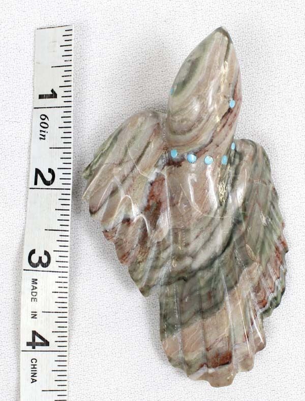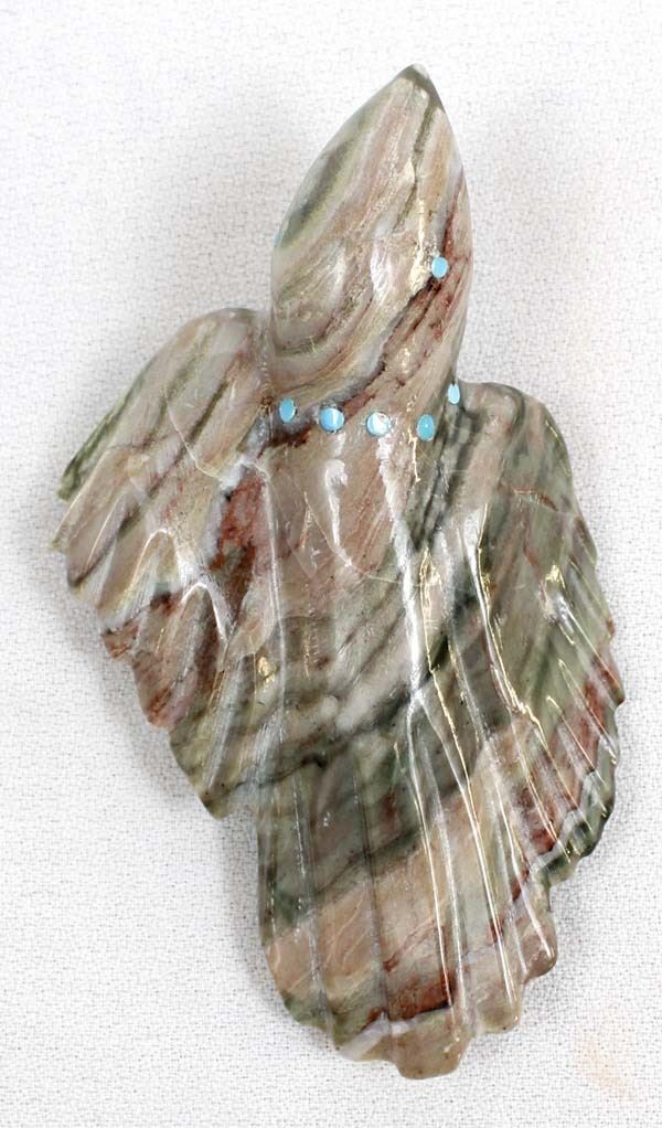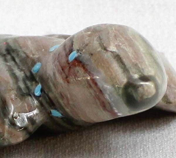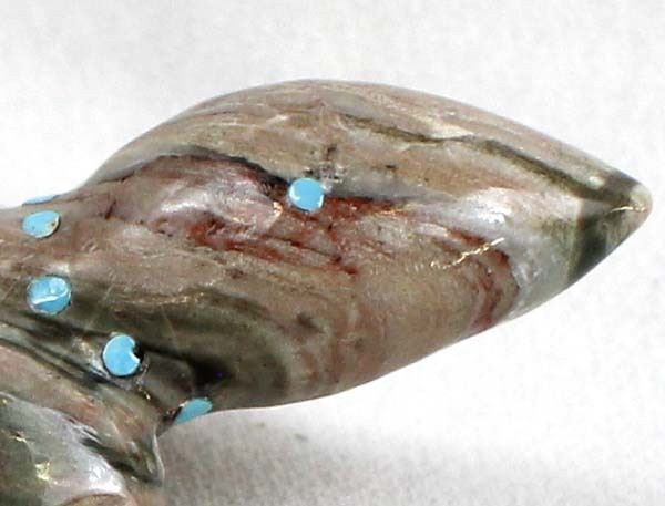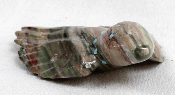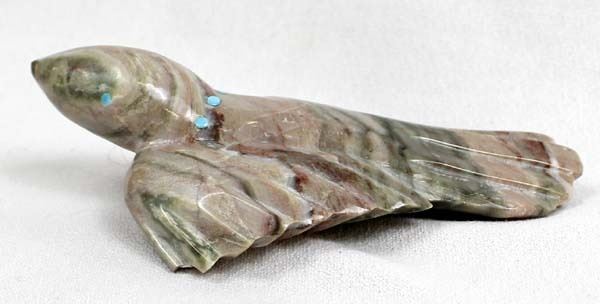 Large Vintage Native American Zuni Picasso Marble Bird Fetish by Thelma, Aaron, and Lorandina Sheche, measures 4.5''L x 2.5'' x 1.25'', embellished with inlay turquoise necklace and eyes, artists' initials on the bottom