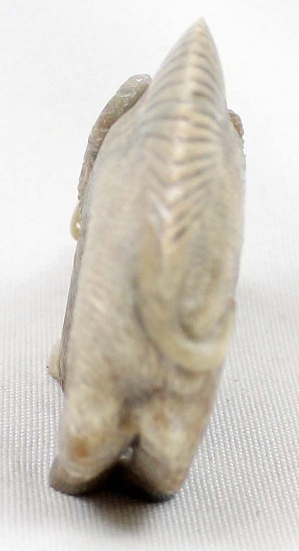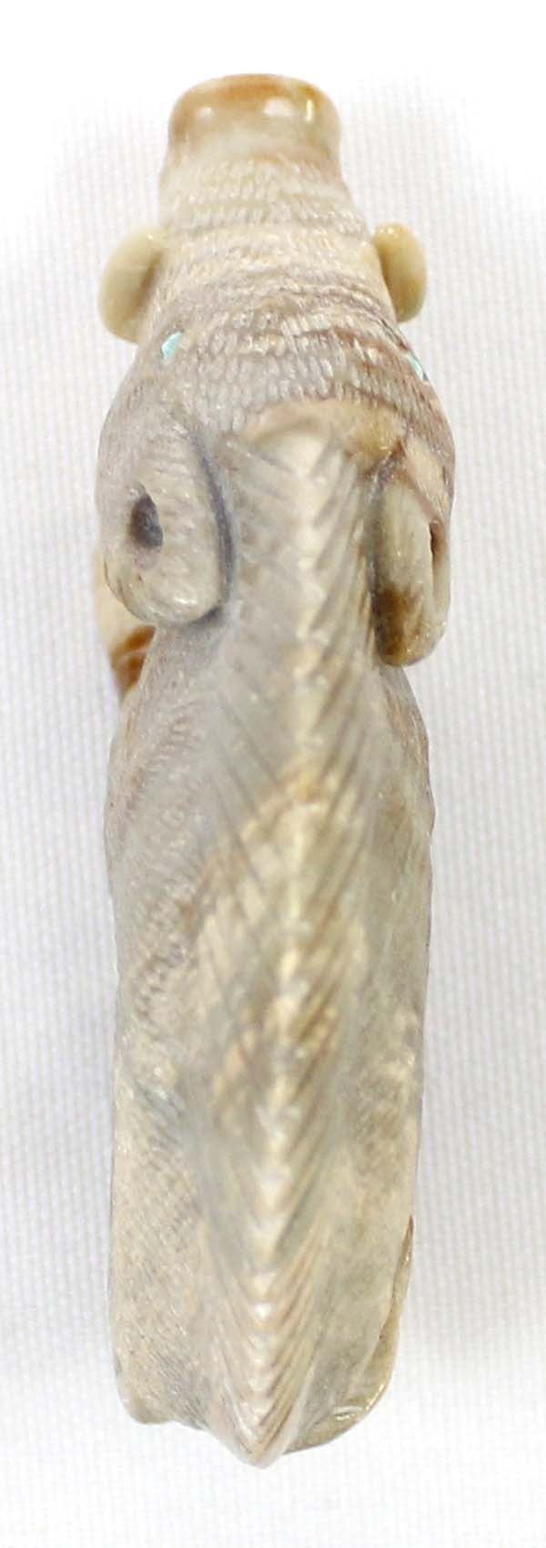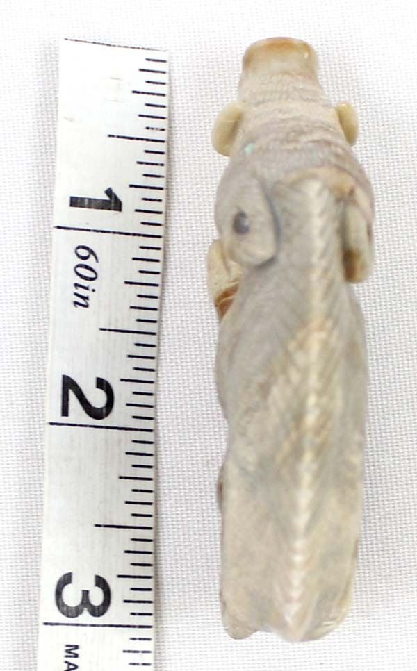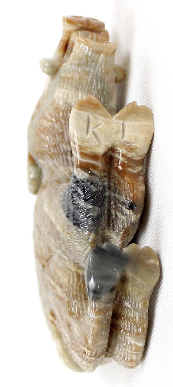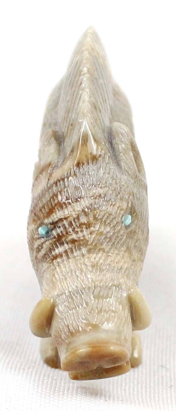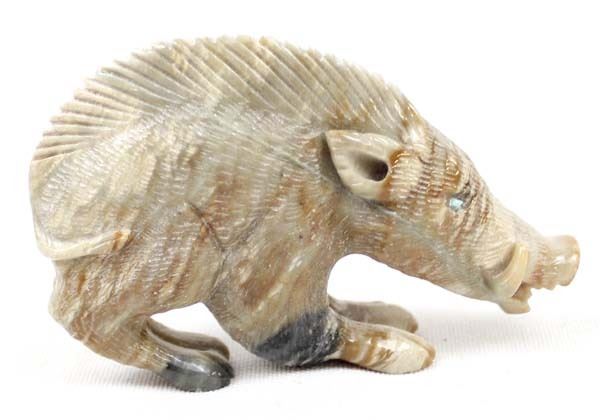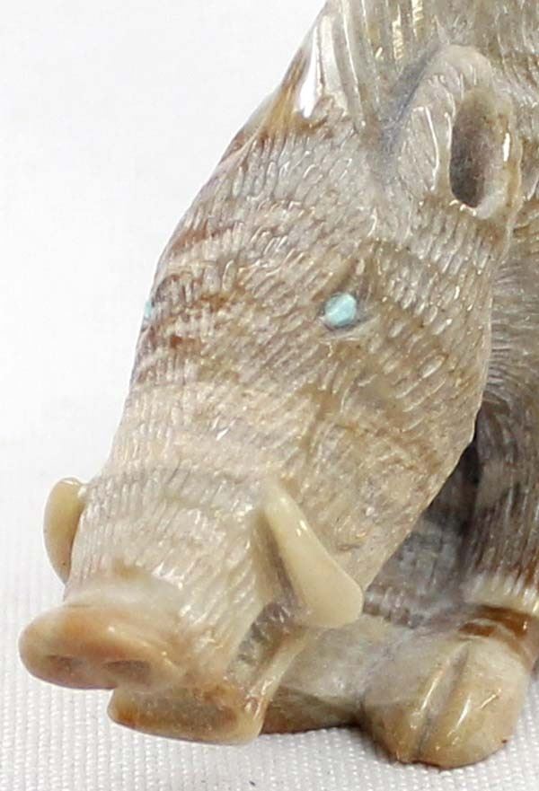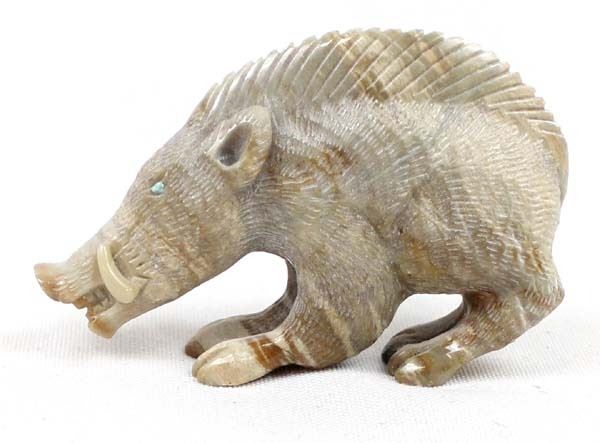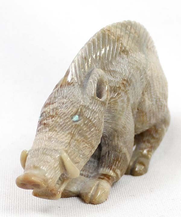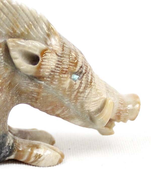 Native American Zuni Picasso Marble Wild Boar Fetish by Randy Lucio, measures 3''L x 2''H x .5''W, has artist's initials on the bottom R. L., turquoise eyes