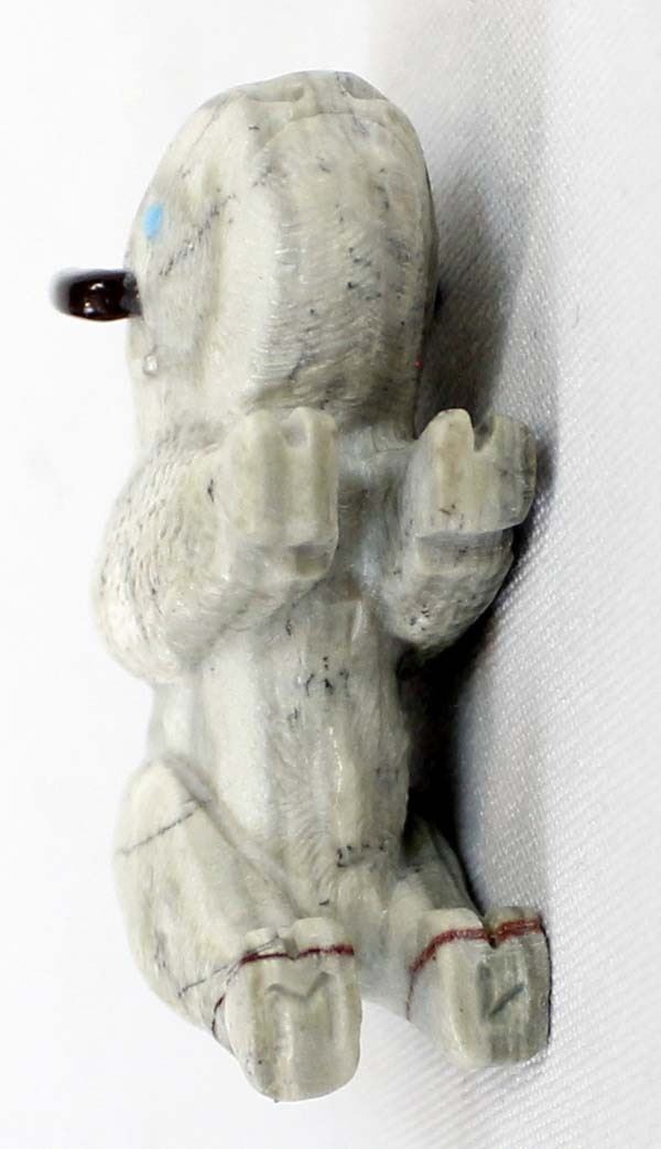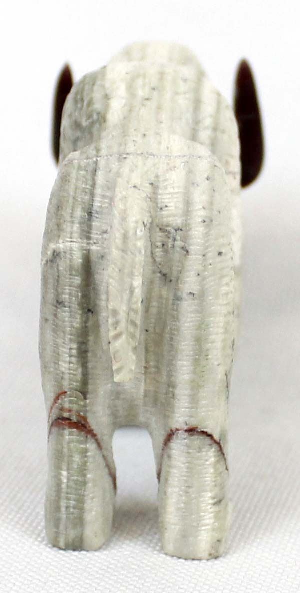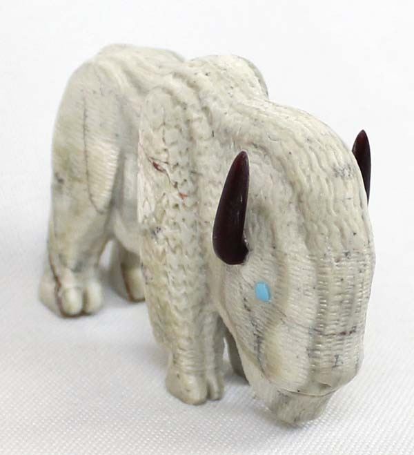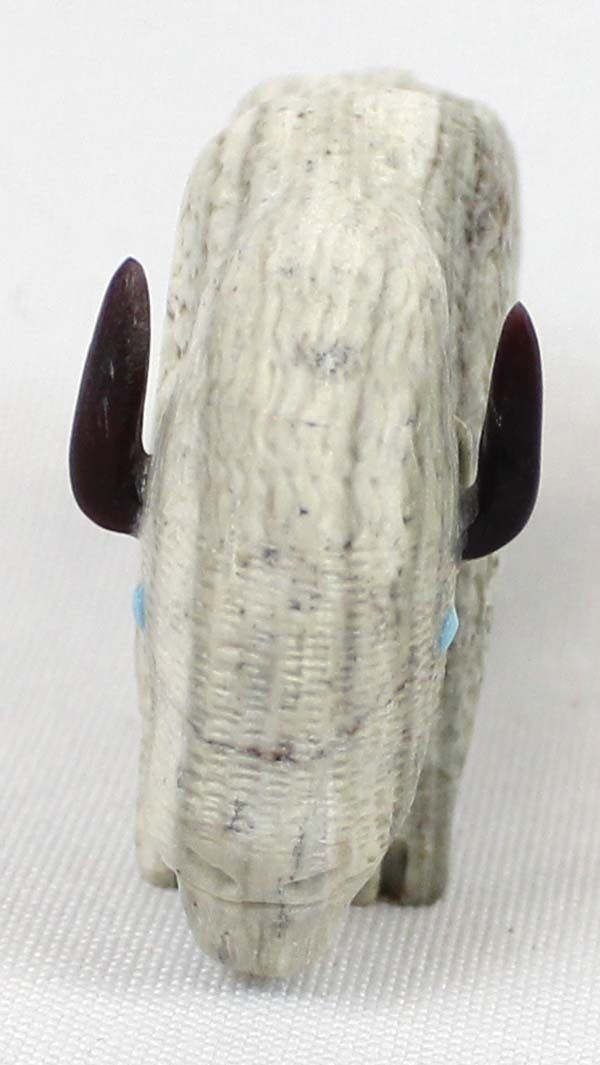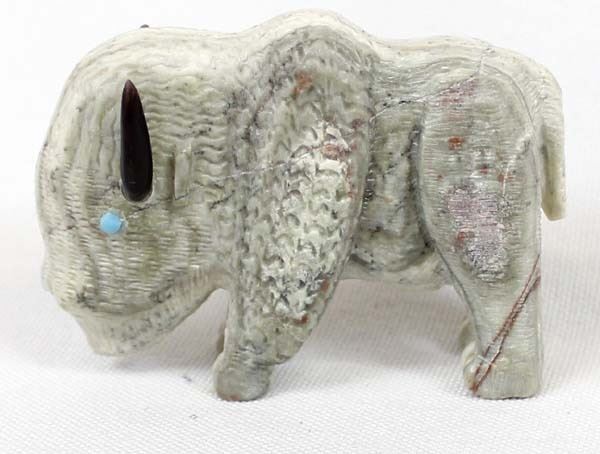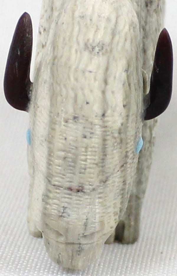 Native American Zuni Picasso Marble Buffalo Fetish by Michael Laweke, measures 2'' x 2.25'' and has artist's initials on the bottom, turquoise eyes, black marble horns